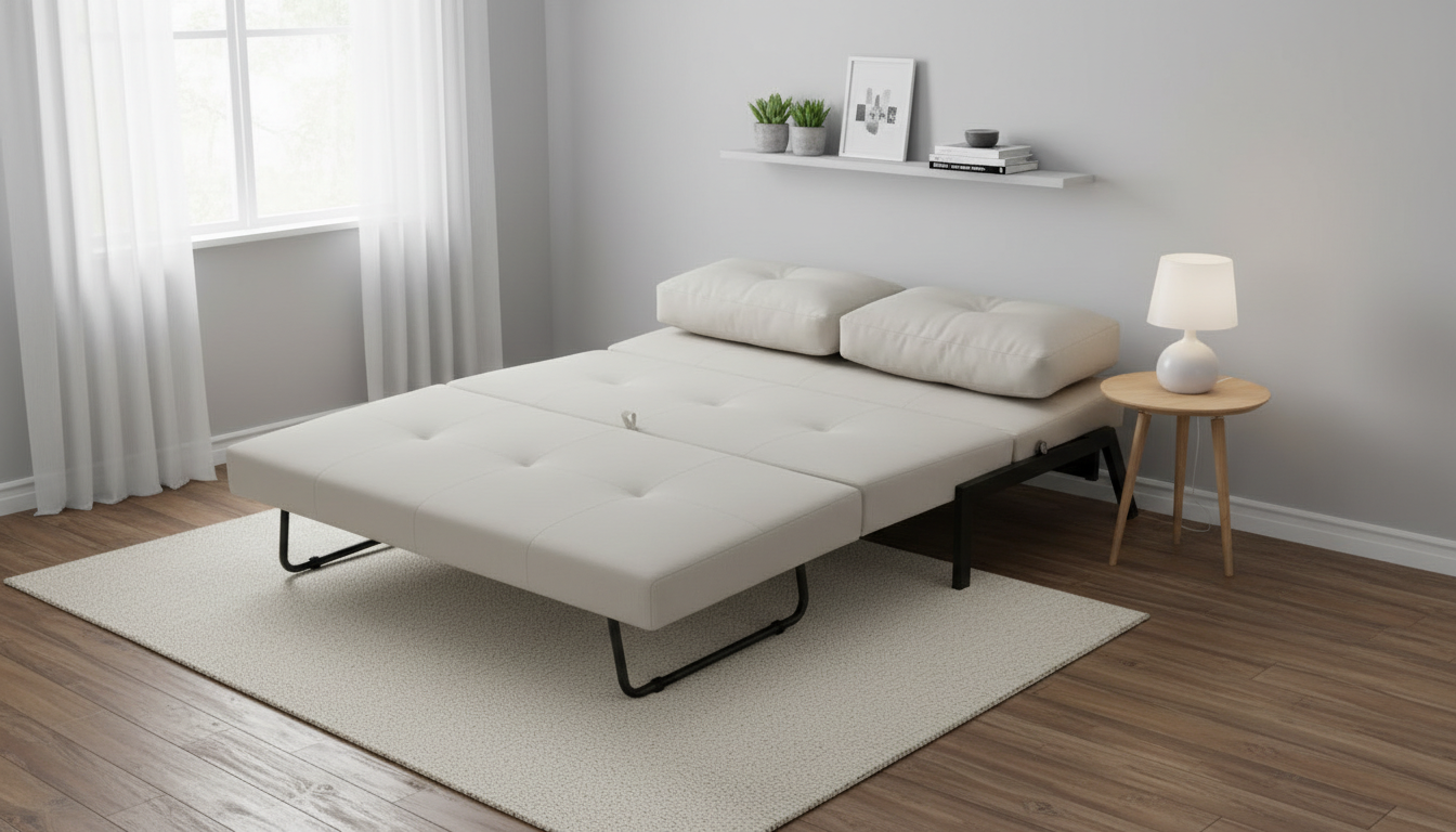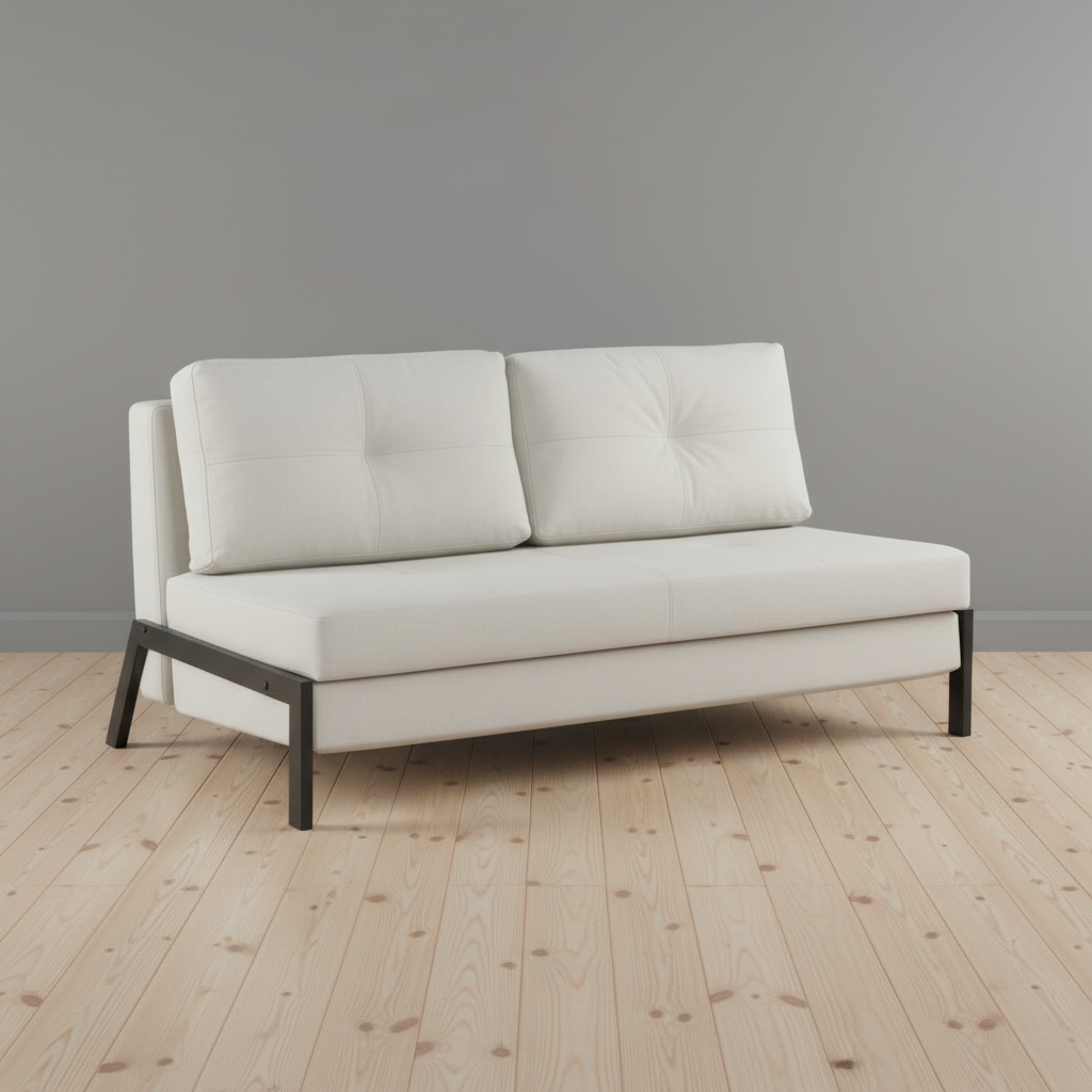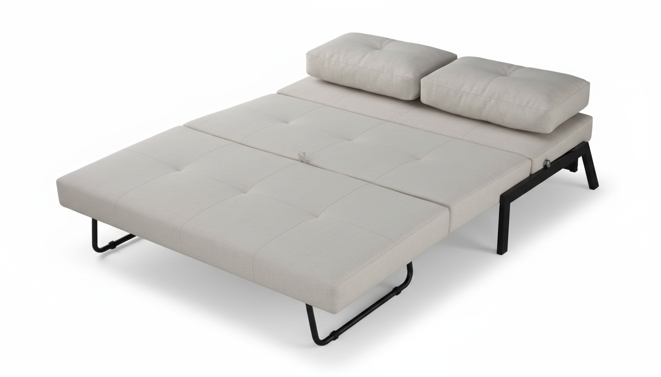 Sofá cama versátil de apertura fácil en tela easy clean, con patas metálicas. Cómodo en modo sofá o cama, ideal para espacios compactos.