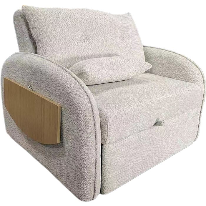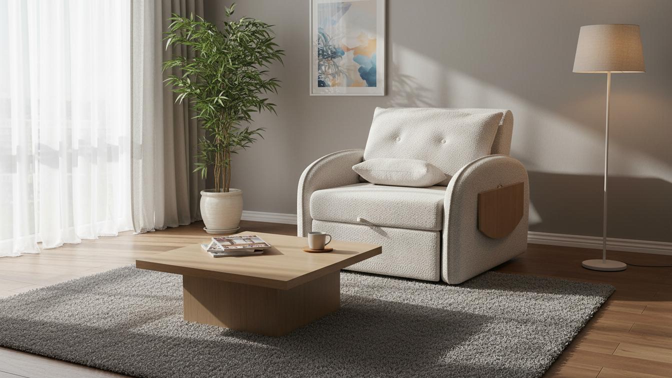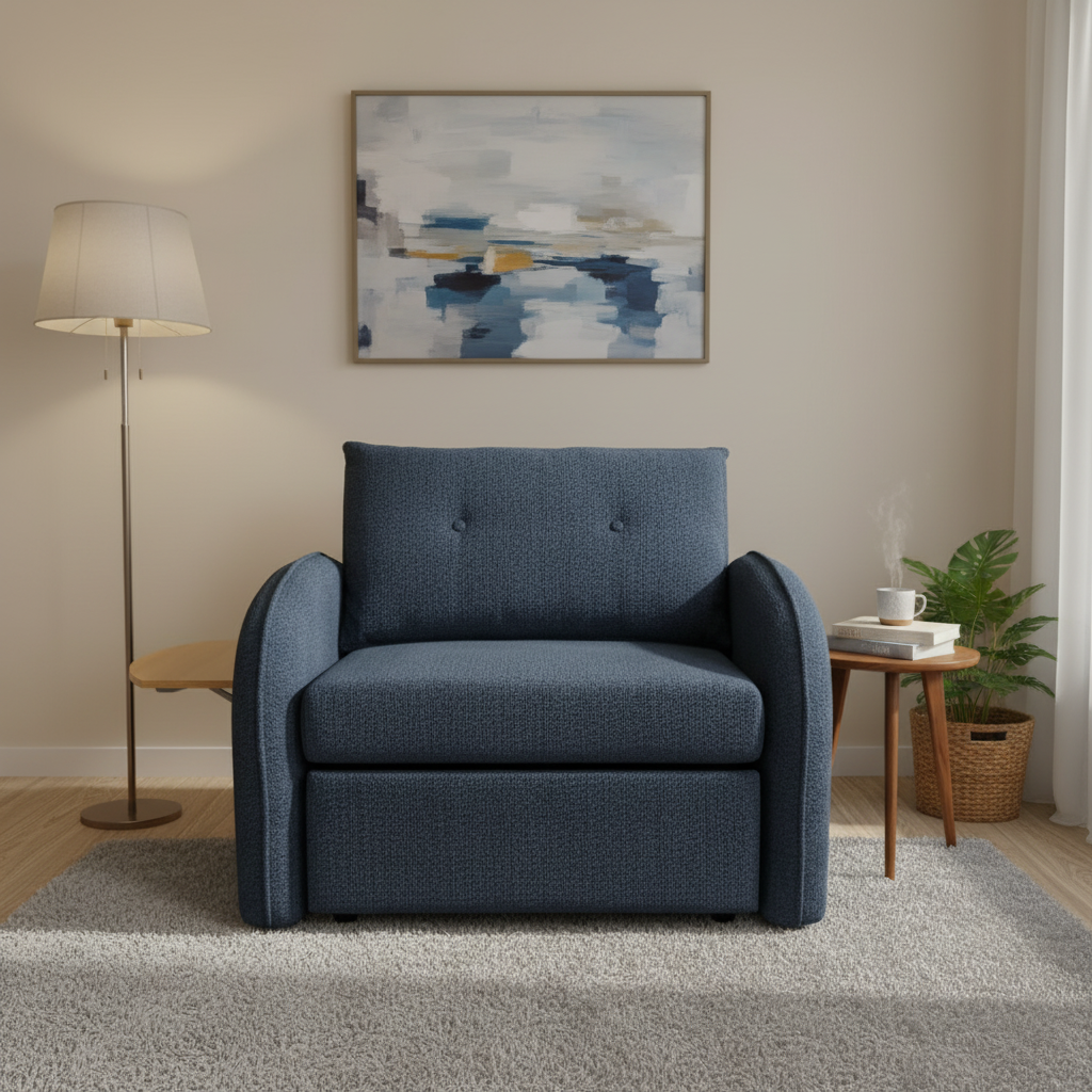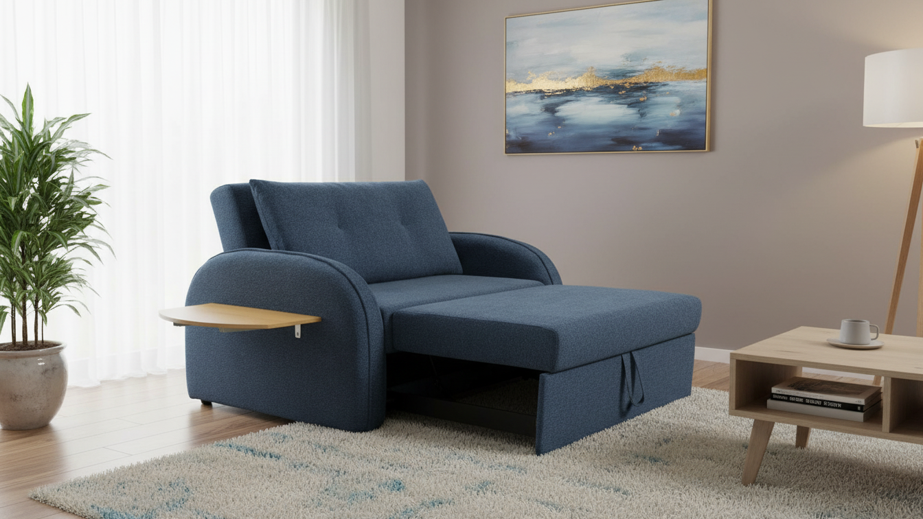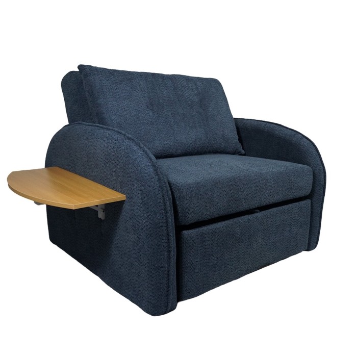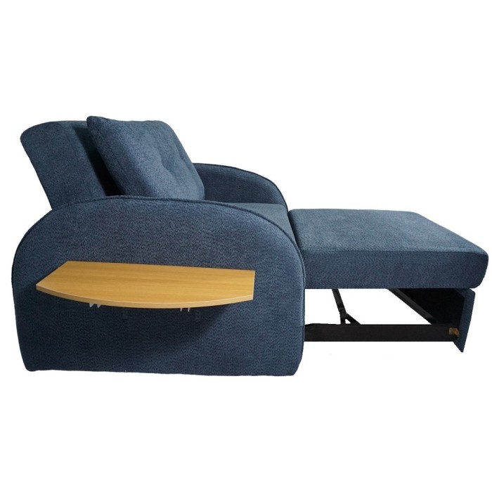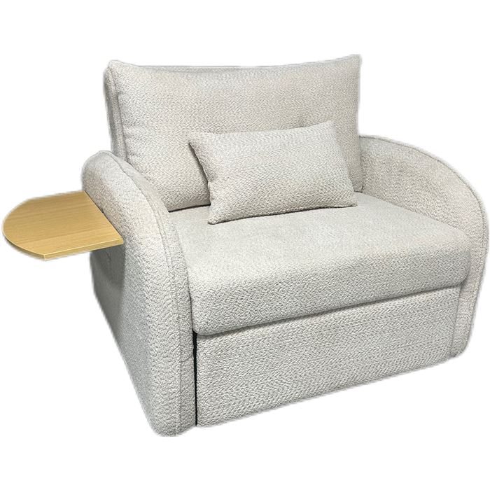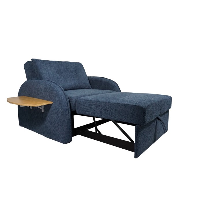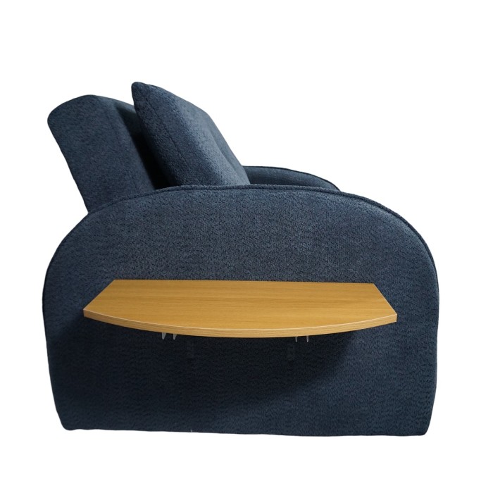 Este sofá cama butaca se caracteriza por su diseño compacto, respaldo cómodo y una bandeja lateral que actúa como mesa auxiliar, convirtiéndose en una cama de forma rápida para ofrecer una plaza extra de descanso en espacios reducidos.