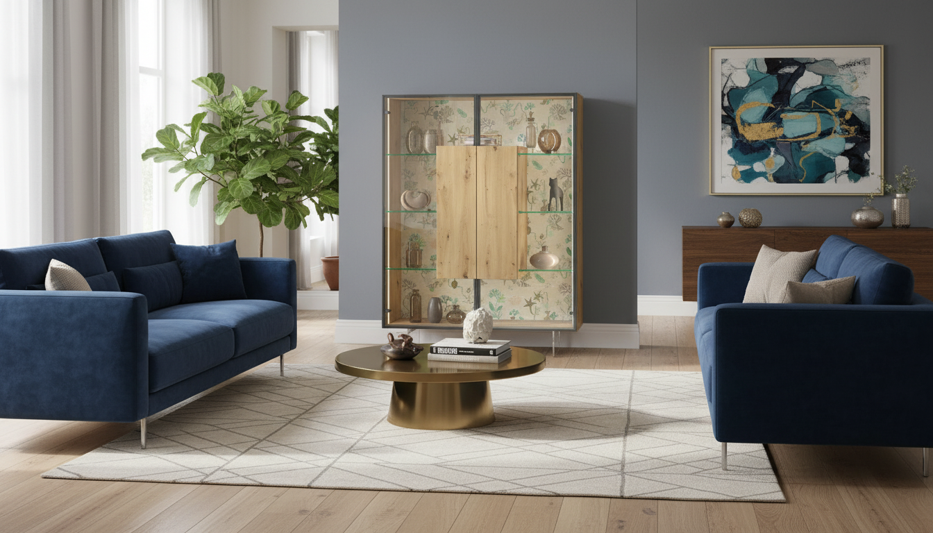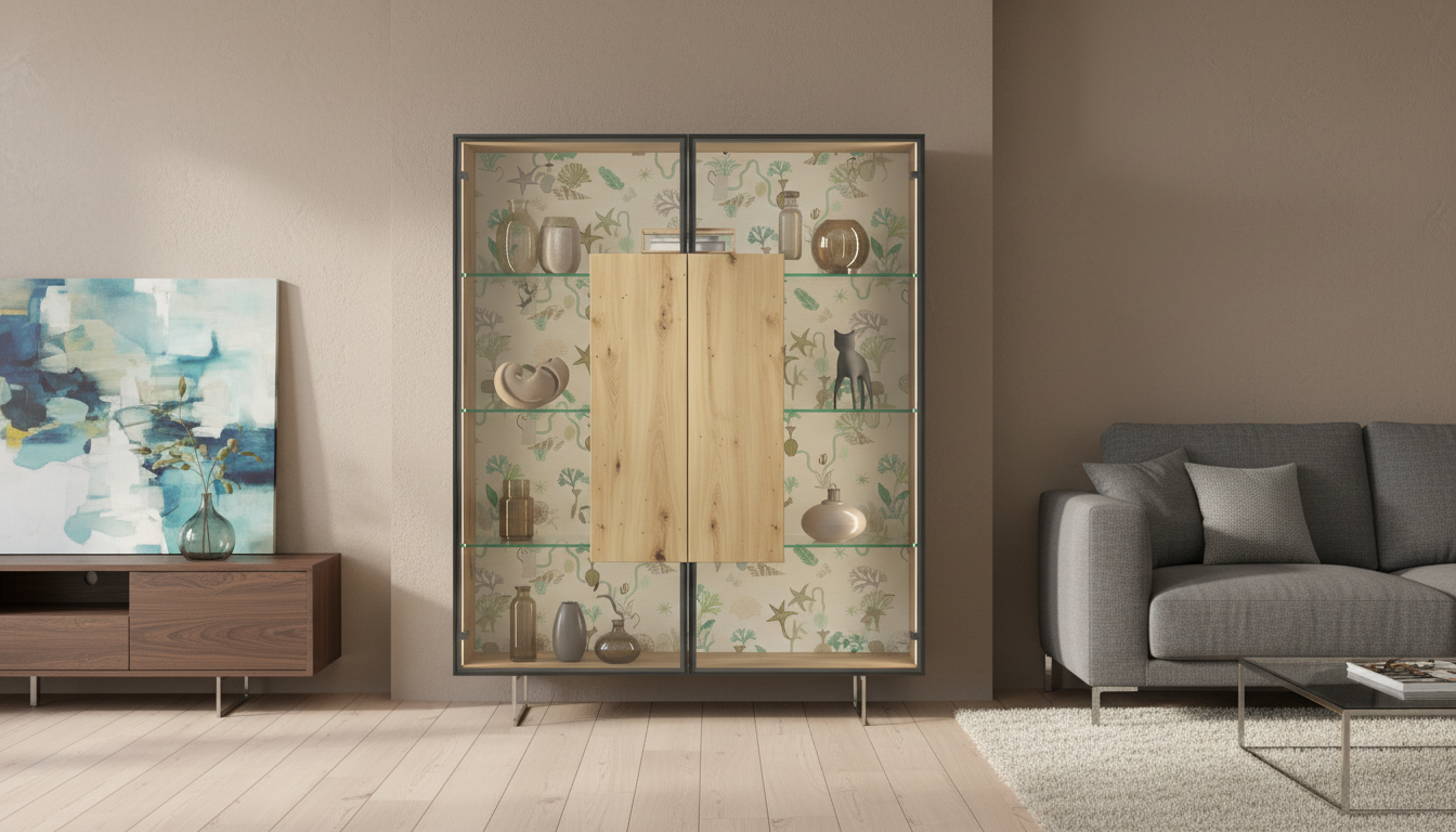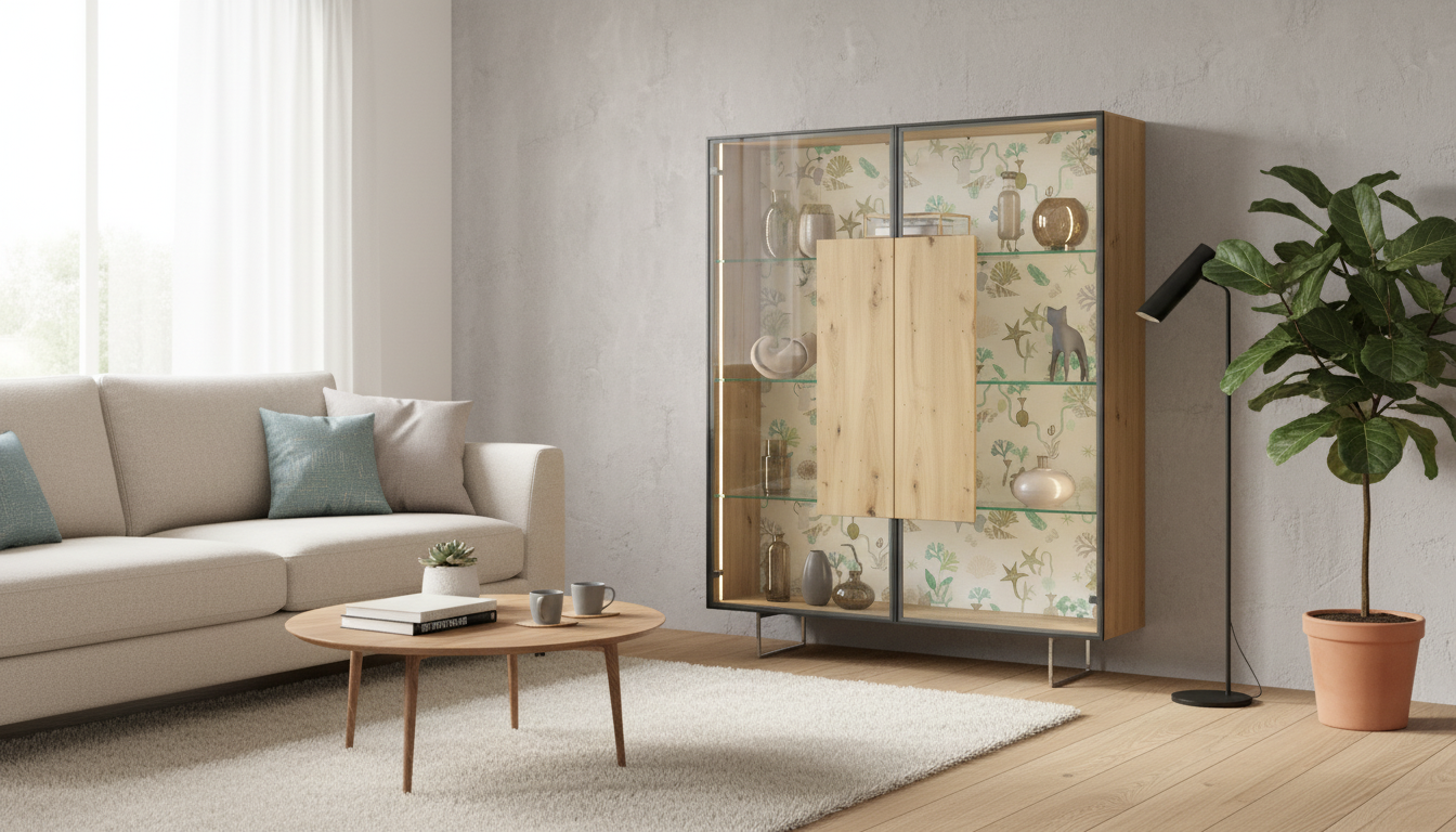 Ofrece una gran capacidad de almacenaje y exposición, combina madera cálida y cristal, y el fondo decorativo convierte cualquier objeto en un punto focal elegante del salón.