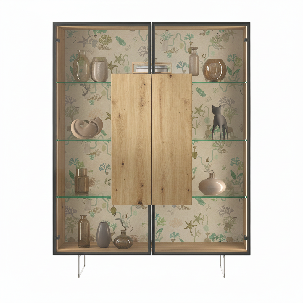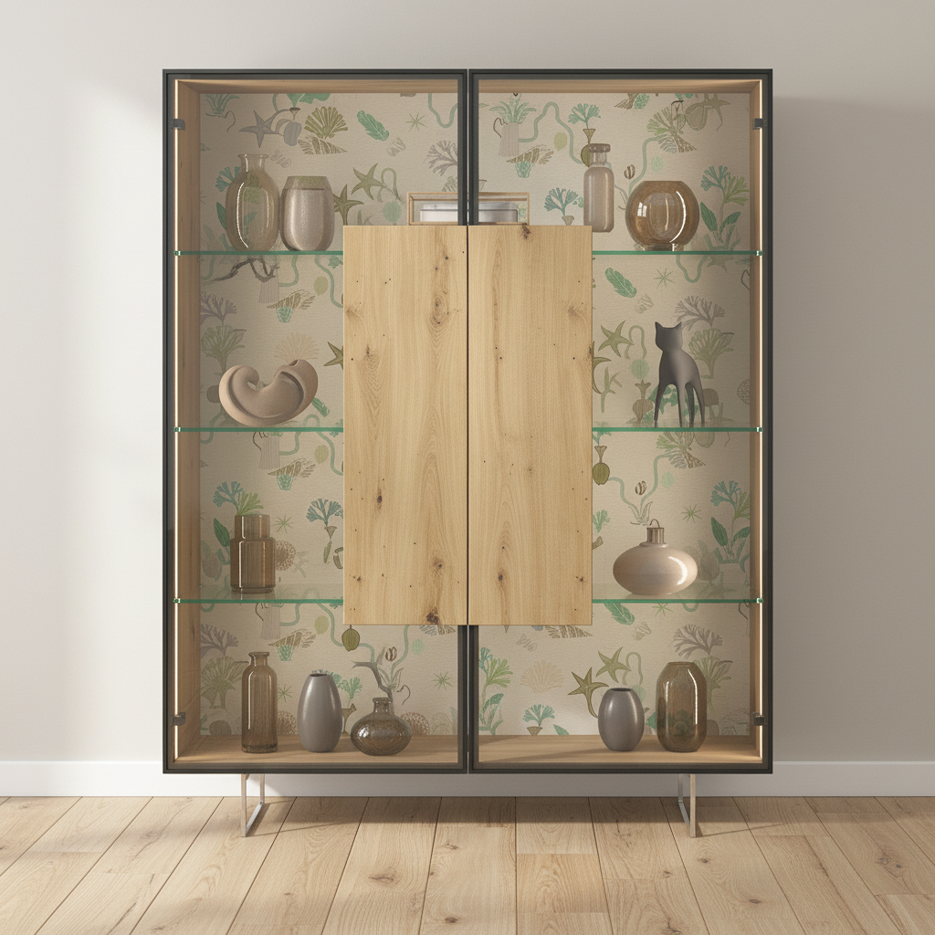 Vitrina de salón moderna, con estructura en roble artesano y panel central decorativo en acabado P08, que combina la calidez de la madera con un diseño contemporáneo ideal para salones actuales. La vitrina mide 120 cm de ancho y 160 cm de alto, incorpora laterales de madera y estantes de cristal que permiten lucir la decoración interior, apoyada sobre patas ligeras que aportan sensación de amplitud al espacio. El fondo incluye papel decorativo, creando un marco original para vajillas, objetos decorativos o colecciones, y puede complementarse opcionalmente con iluminación interior para realzar aún más su contenido.