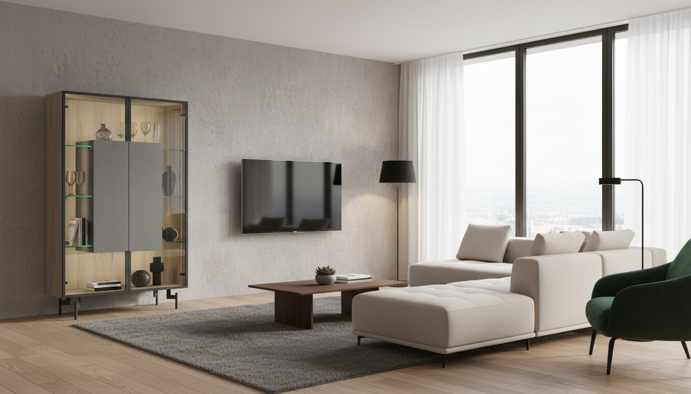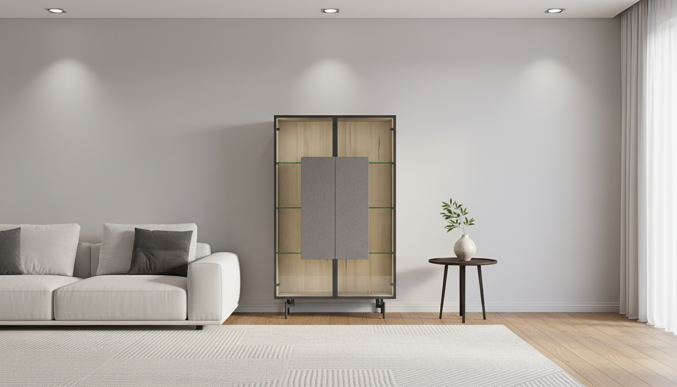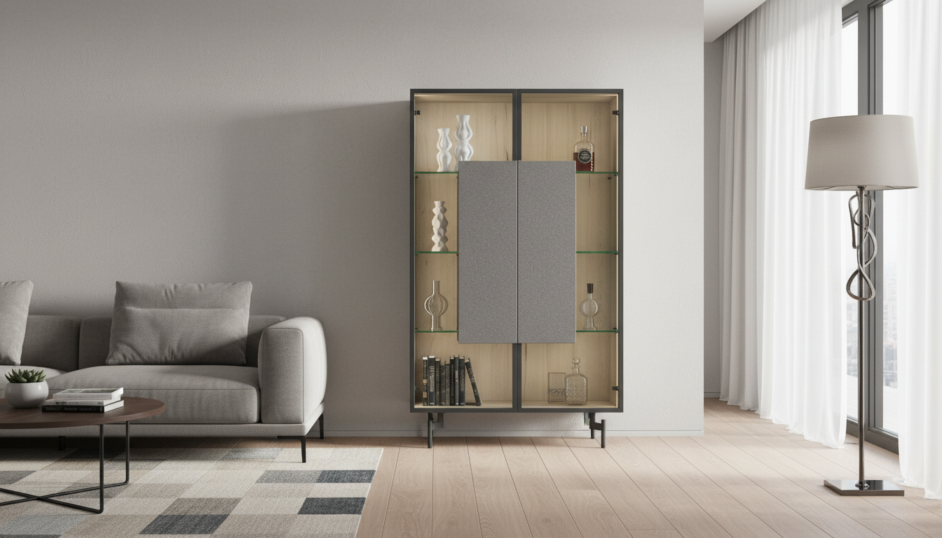 Vitrina elegante en haya clara y cotton gris, con puertas de tela, cristales laterales y patas metálicas negras. Perfecta para exponer con estilo en salones modernos.