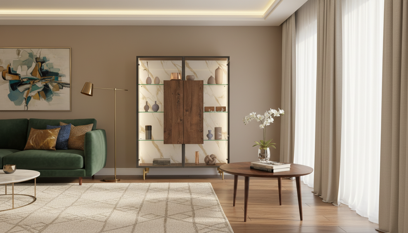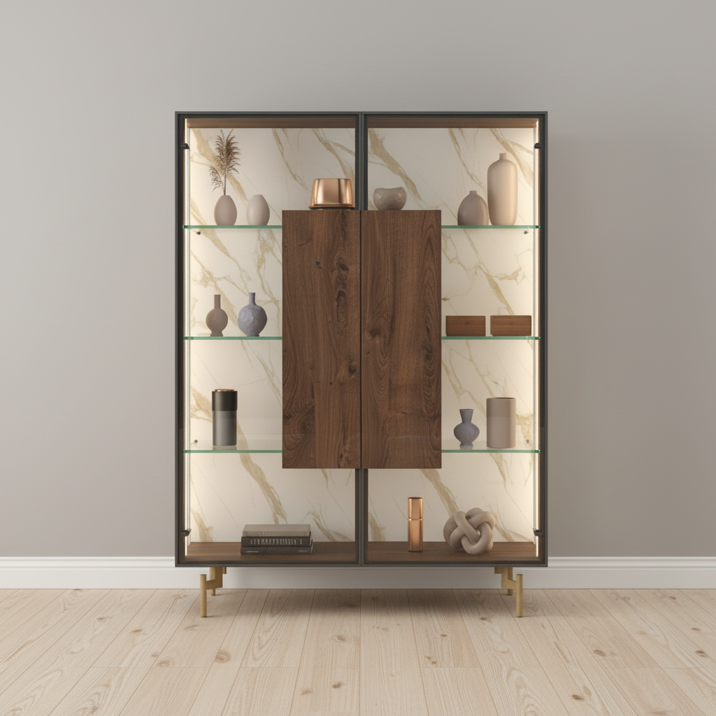 Vitrina moderna en roble brown y mármol oro, con cristal en laterales y puertas, iluminación opcional y patas metálicas. Diseño elegante para exponer objetos decorativos.