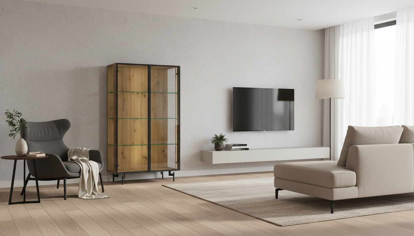 Vitrina luminosa de roble artesano con puertas y estantes de cristal, marco aluminio grafito y patas metálicas. Perfecta para exponer con elegancia sin sobrecargar el espacio.