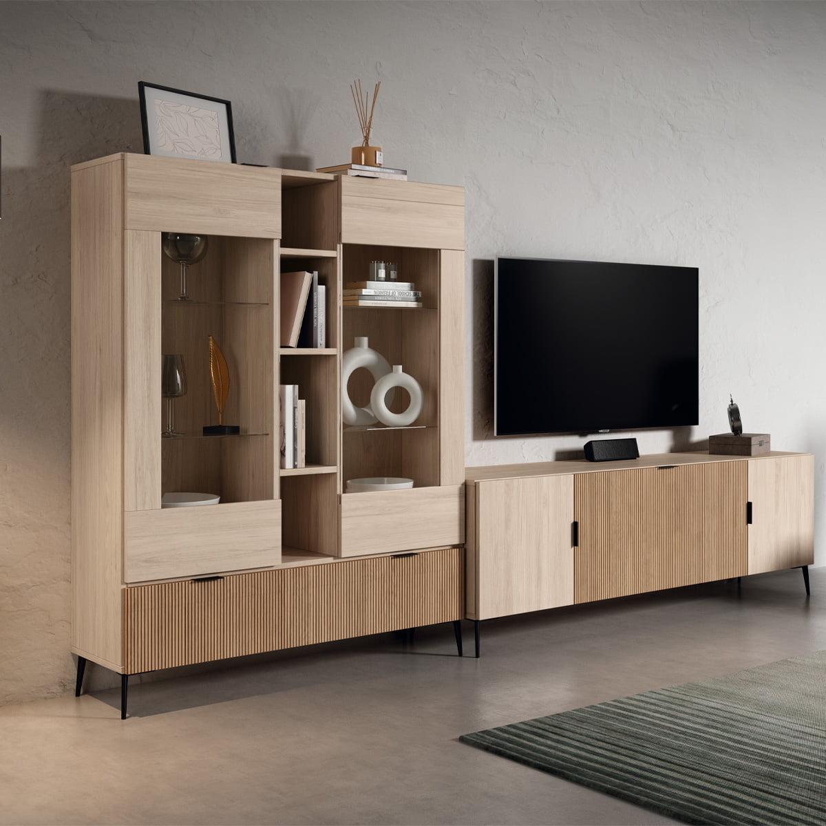 Ofrece una gran capacidad de almacenaje en poco ancho, combina zonas vistas y ocultas y su diseño moderno en madera y metal encaja en salones actuales sin recargar el espacio.