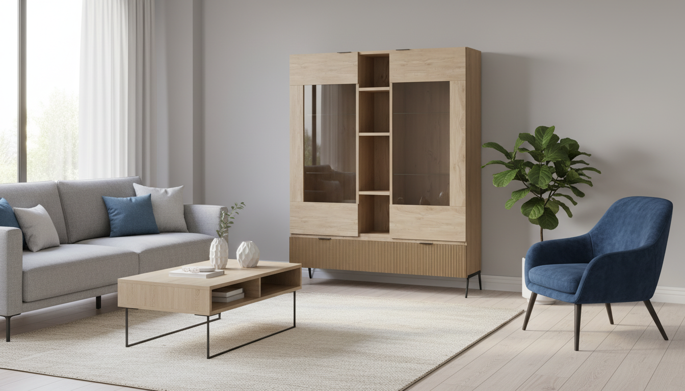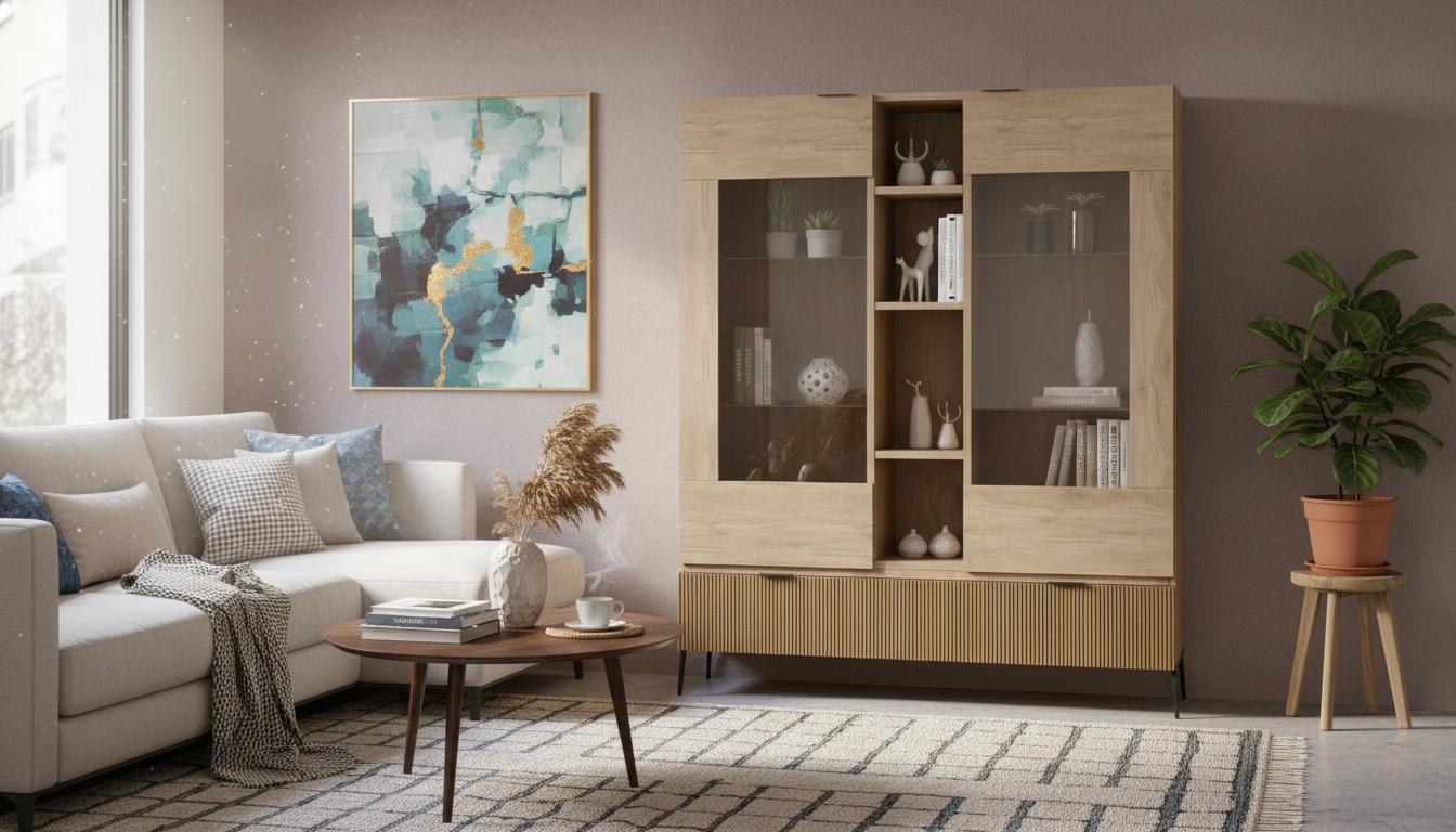 Vitrina con diseño moderno y líneas depuradas, perfecta para salones actuales que buscan ligereza visual y buena capacidad de almacenaje. Combina estructura en acabado madera clara con patas metálicas altas en negro, lo que facilita la limpieza del suelo y aporta un toque elegante. Incorpora dos amplias zonas acristaladas para lucir vajilla u objetos decorativos, y una práctica estantería central abierta para libros o piezas especiales. En la parte inferior dispone de un módulo cerrado tipo cajón o contenedor con frente ranurado, ideal para guardar mantelería, copas o accesorios que no quieras tener a la vista. Sus medidas de 120x140x35 cm la convierten en una solución compacta pero muy funcional para salones, comedores o espacios abiertos donde aprovechar al máximo la altura sin recargar el ambiente.