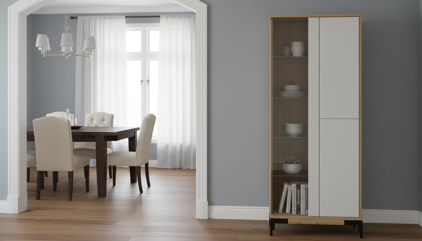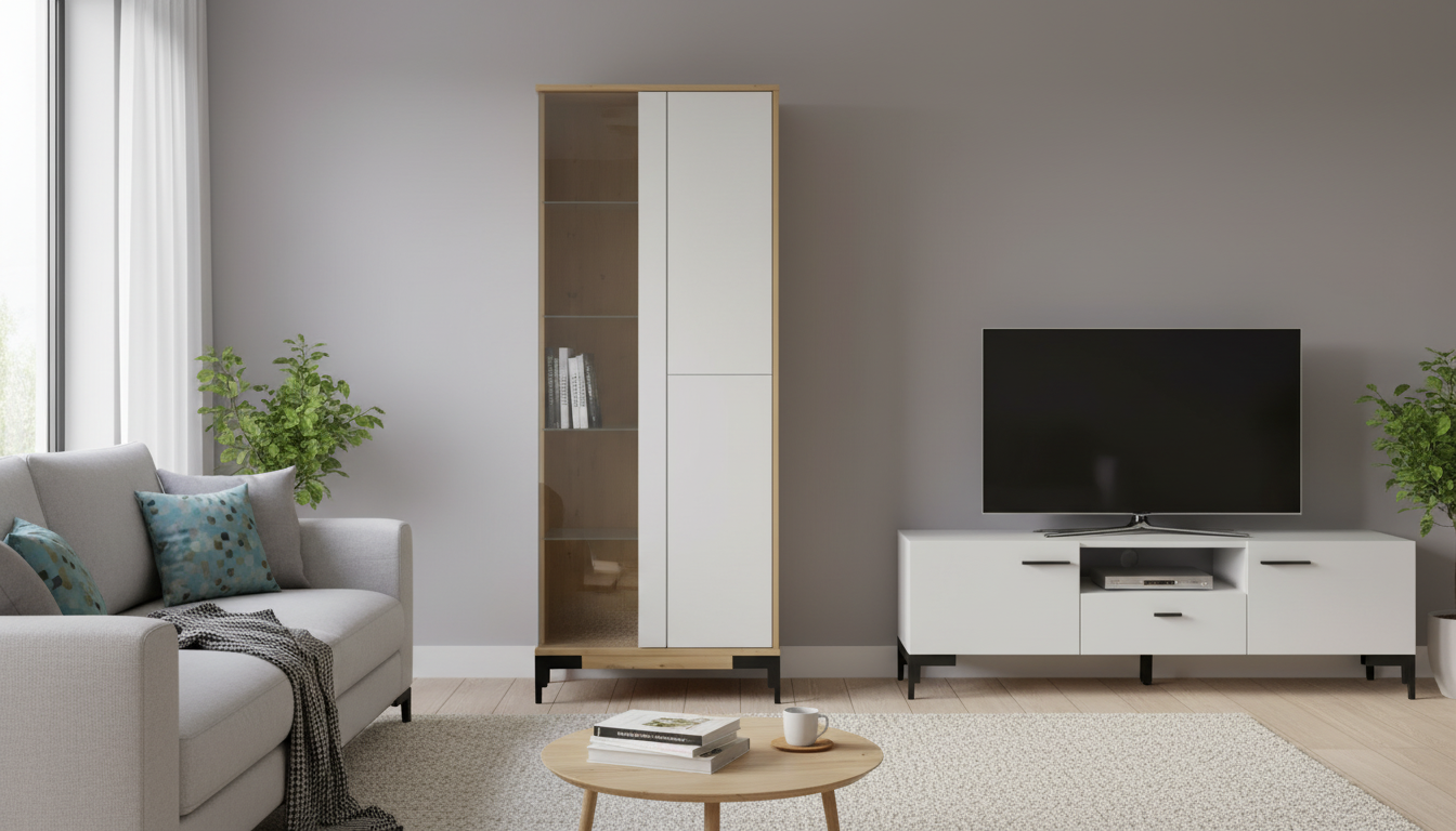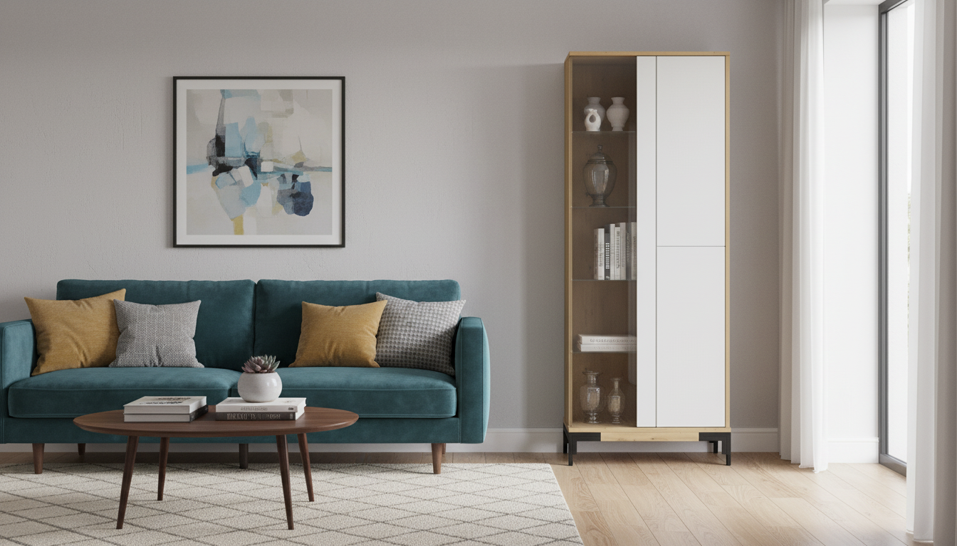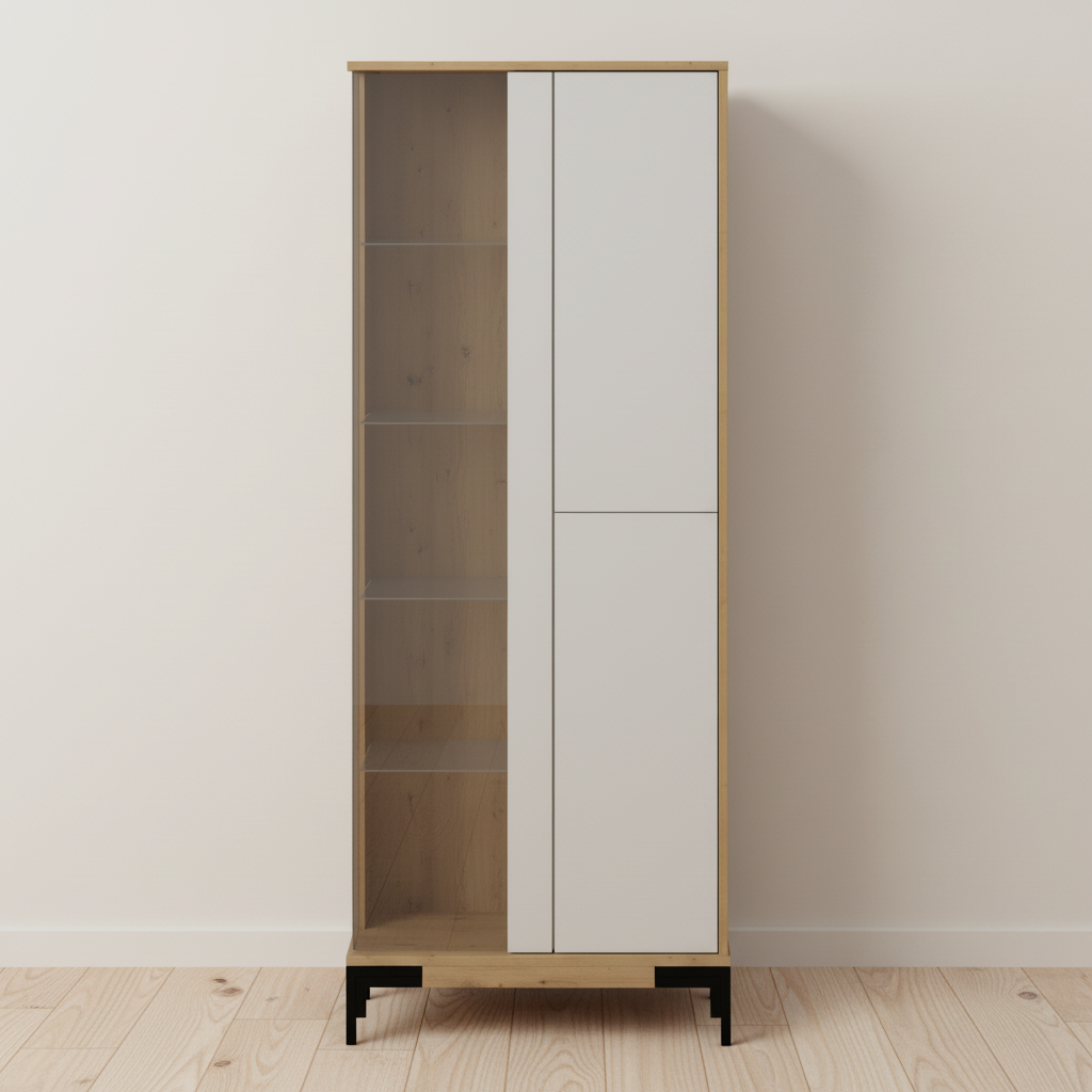 Vitrina de estilo nórdico–industrial, combinando estructura en acabado roble claro con frentes lisos en color blanco y patas metálicas negras elevadas que aportan ligereza visual. El lateral abierto con baldas vistas permite exponer libros u objetos decorativos, mientras que las puertas ocultas ofrecen espacio de almacenamiento cerrado para mantener el orden en el salón o comedor. Su diseño recto y minimalista encaja en interiores modernos y se integra fácilmente con otros muebles de líneas sencillas y tonos naturales. Las medidas aproximadas son 75x178x35 cm, ideales para espacios pequeños donde se necesita capacidad vertical sin ocupar demasiada superficie en el suelo.
