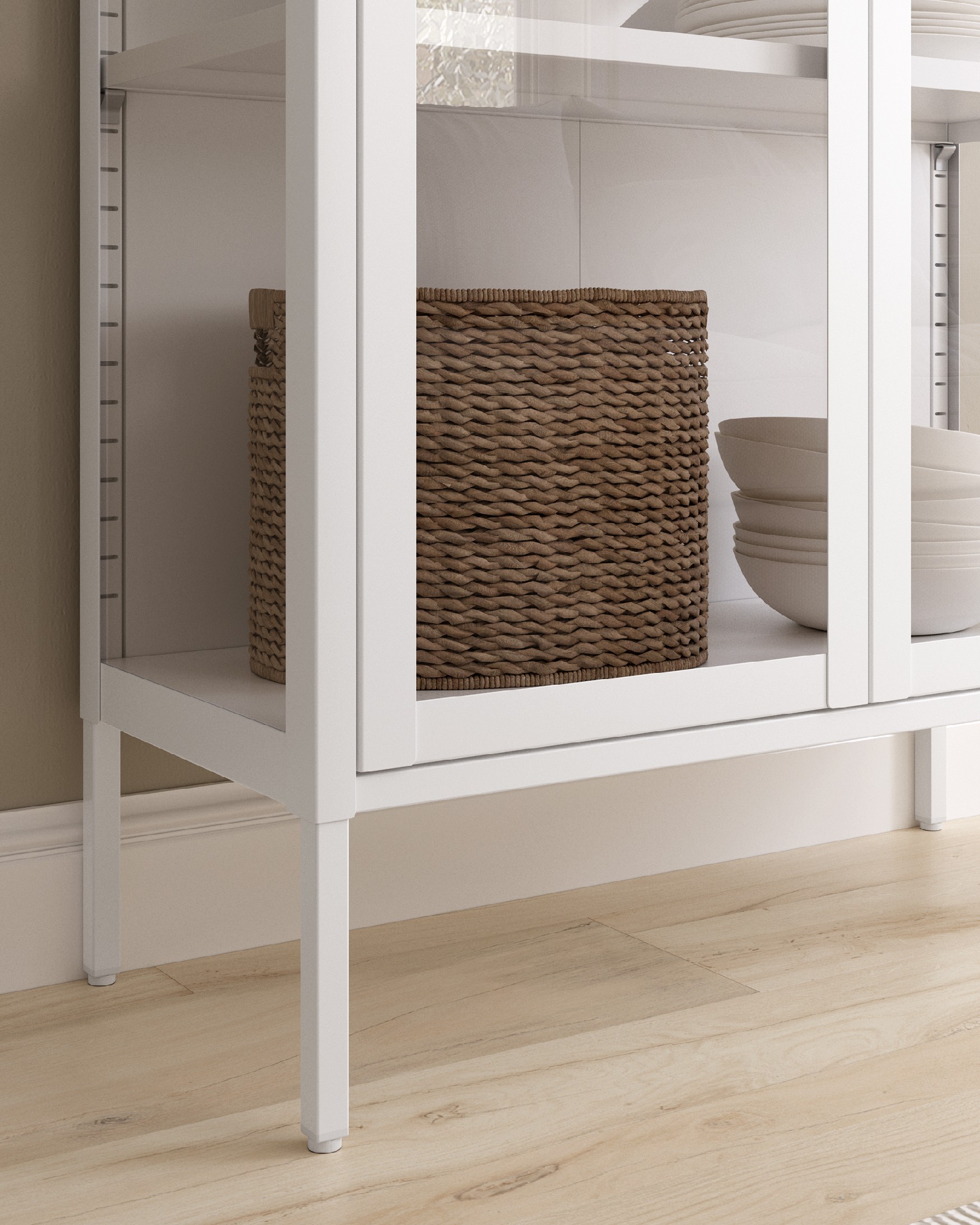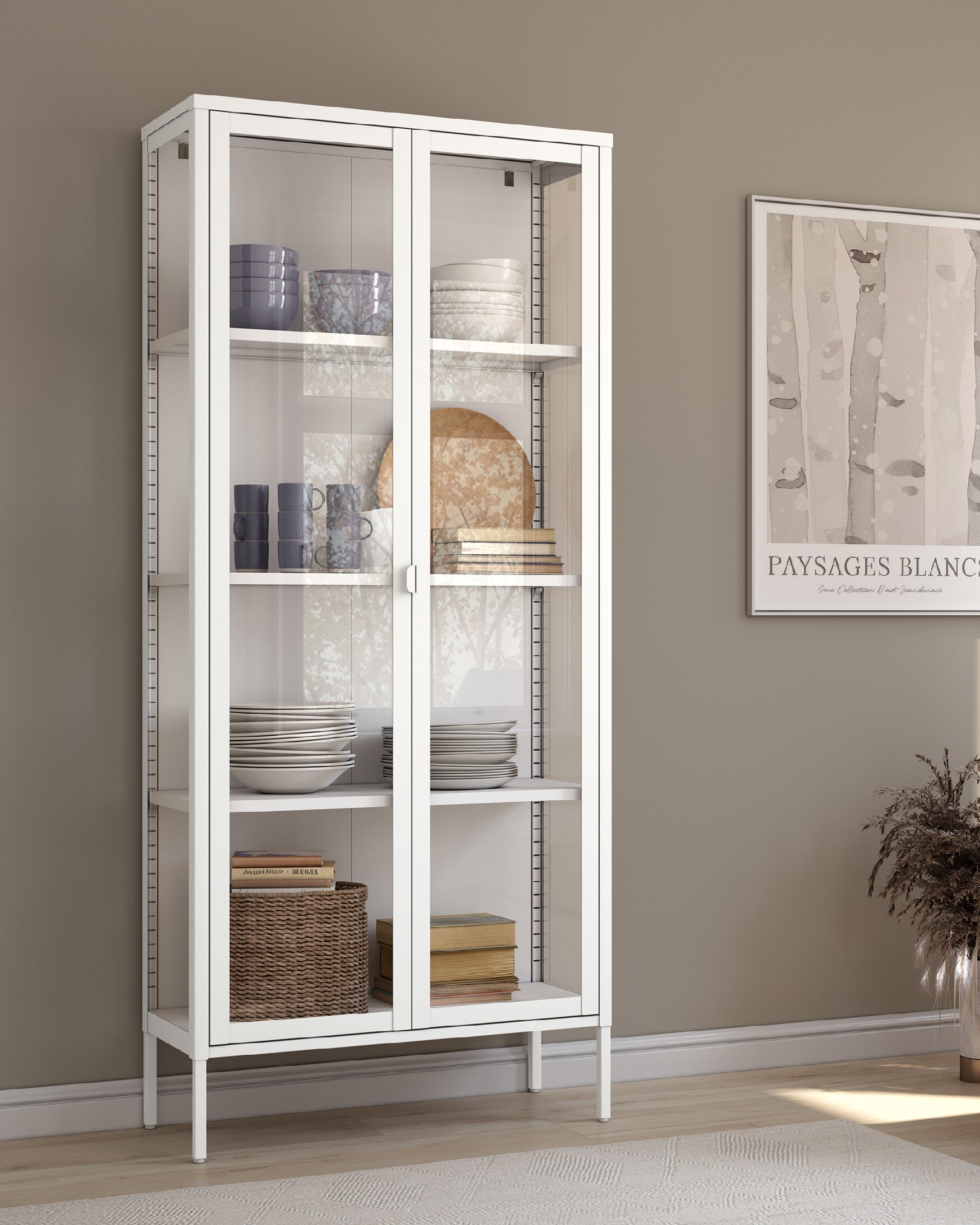 Vitrina de diseño contemporáneo en metal blanco, ideal para exponer y proteger objetos decorativos, vajilla o libros en cualquier estancia del hogar. Su estructura alta y estrecha descansa sobre cuatro patas estilizadas que aportan ligereza visual y facilitan la limpieza del suelo. Incorpora dos puertas frontales acristaladas de marco fino que permiten una visión completa del interior, a la vez que resguardan el contenido del polvo. En su interior dispone de varias baldas regulables que optimizan el espacio de almacenaje y se adaptan a diferentes alturas. El acabado blanco mate combina fácilmente con estilos nórdicos, minimalistas o industriales discretos.