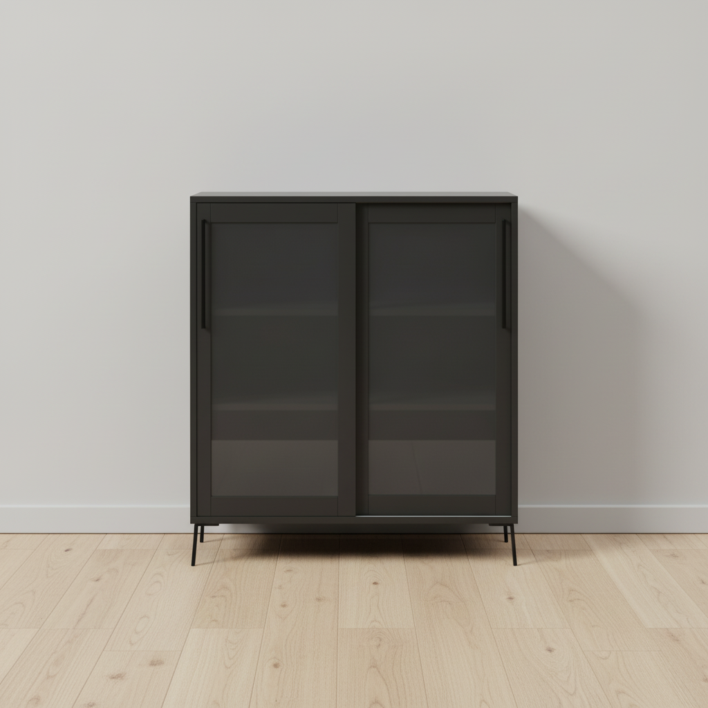 Vitrina moderna de estilo minimalista en color negro mate, con estructura metálica sólida y puertas correderas de cristal opaco que protegen el interior del polvo. Ofrece tres amplias baldas interiores ideales para vajilla, libros o decoración. Sus patas altas y finas aportan ligereza visual y facilitan la limpieza del suelo. El diseño recto y elegante encaja en salones, comedores, despachos o recibidores actuales. Es una pieza funcional y estética que combina almacenaje cerrado y exposición discreta, perfecta para crear ambientes ordenados y contemporáneos en el hogar.