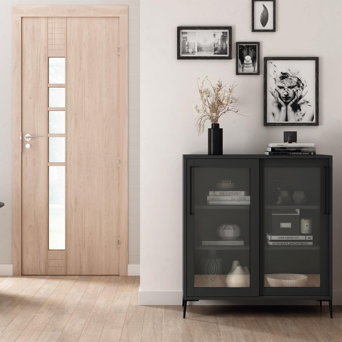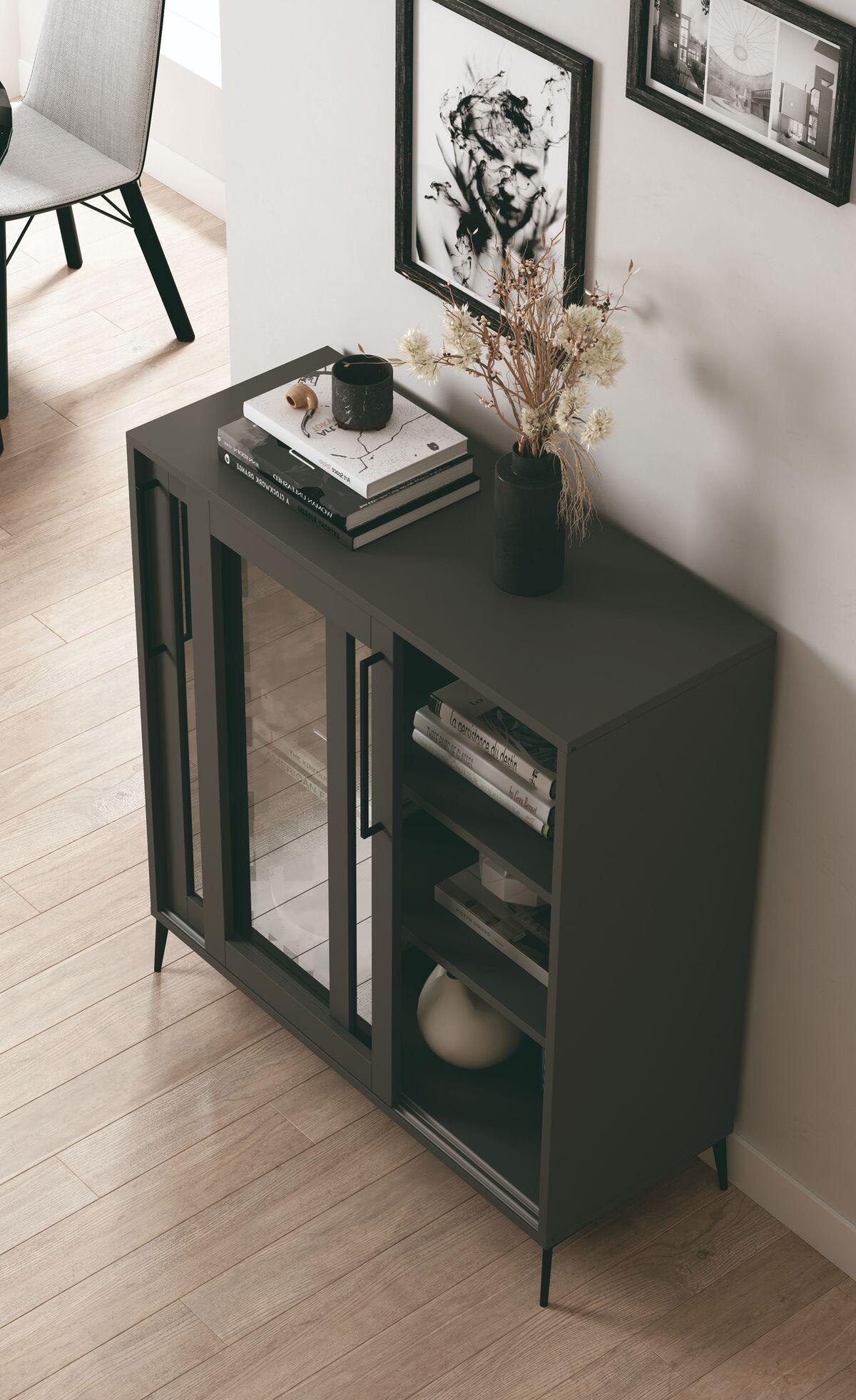 Ofrece gran capacidad de almacenaje en un diseño compacto, protege del polvo gracias a sus puertas de cristal y su estilo moderno combina fácilmente con otros muebles.