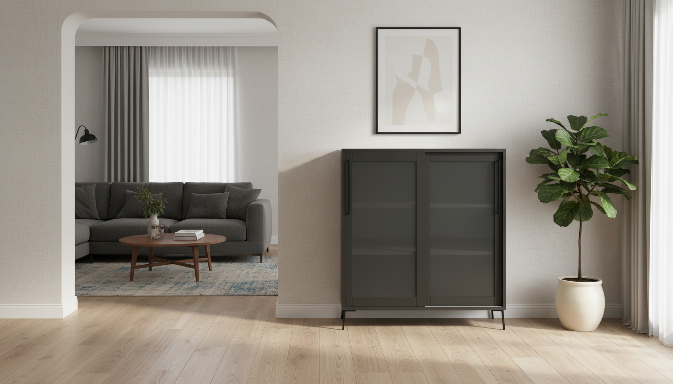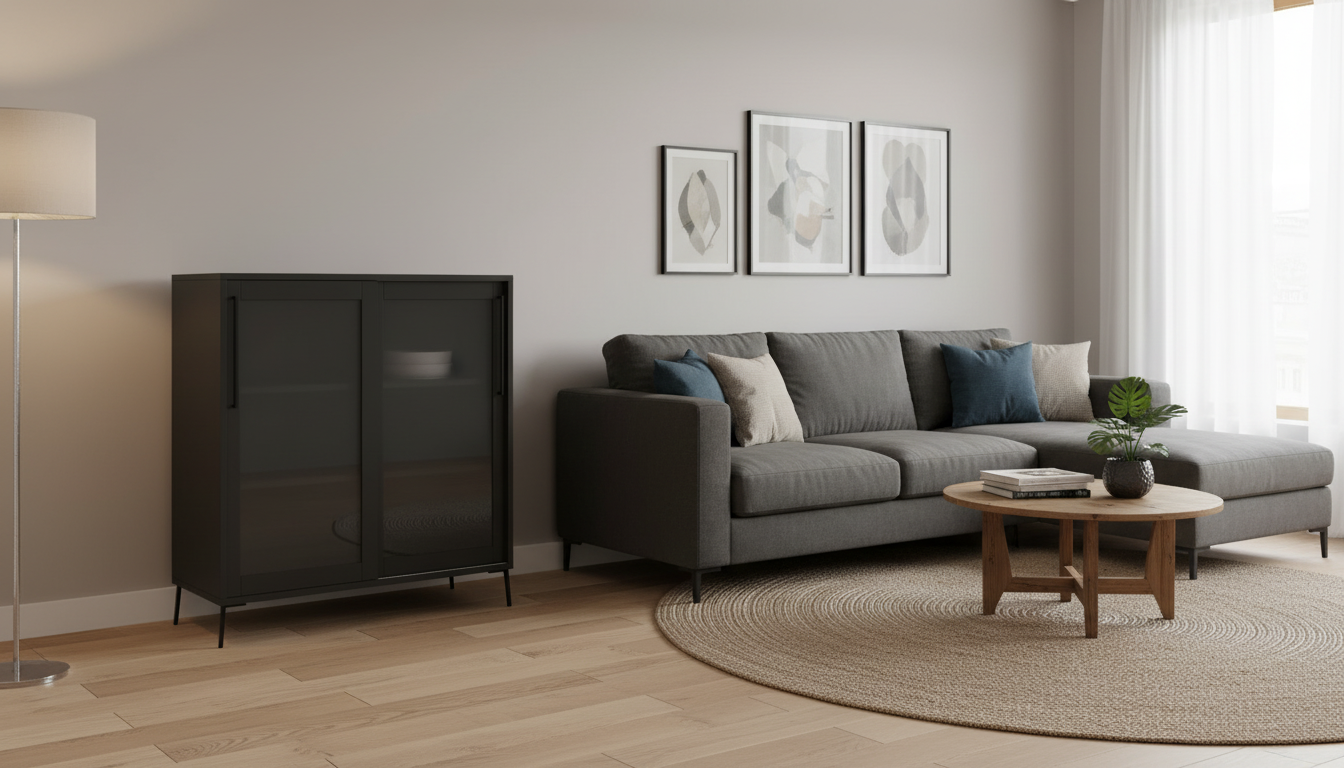 Vitrina baja de estilo moderno en metal negro, con puertas correderas de cristal y patas altas que facilitan la limpieza. Ideal para guardar y exponer objetos de forma discreta en salones o comedores contemporáneos.