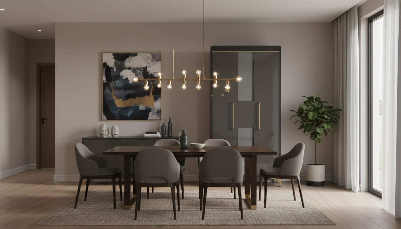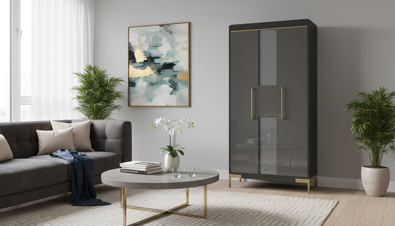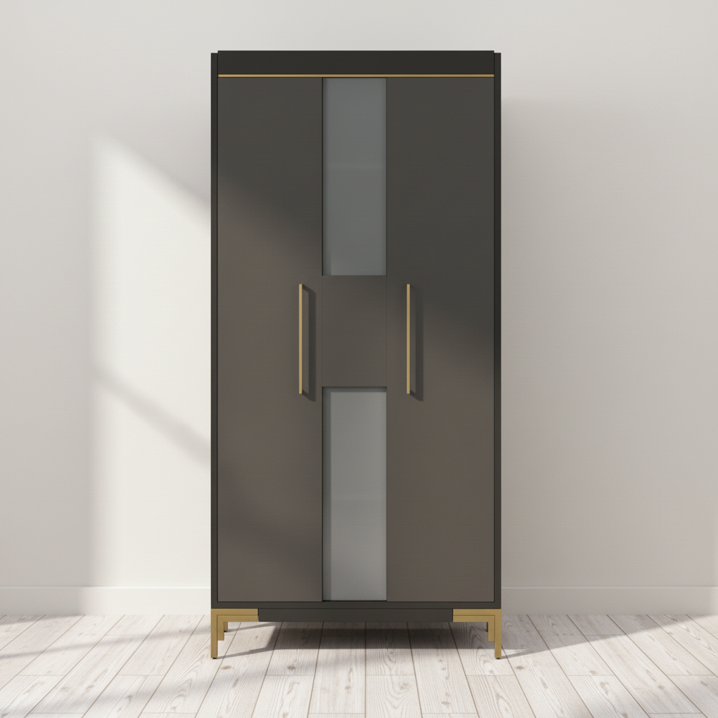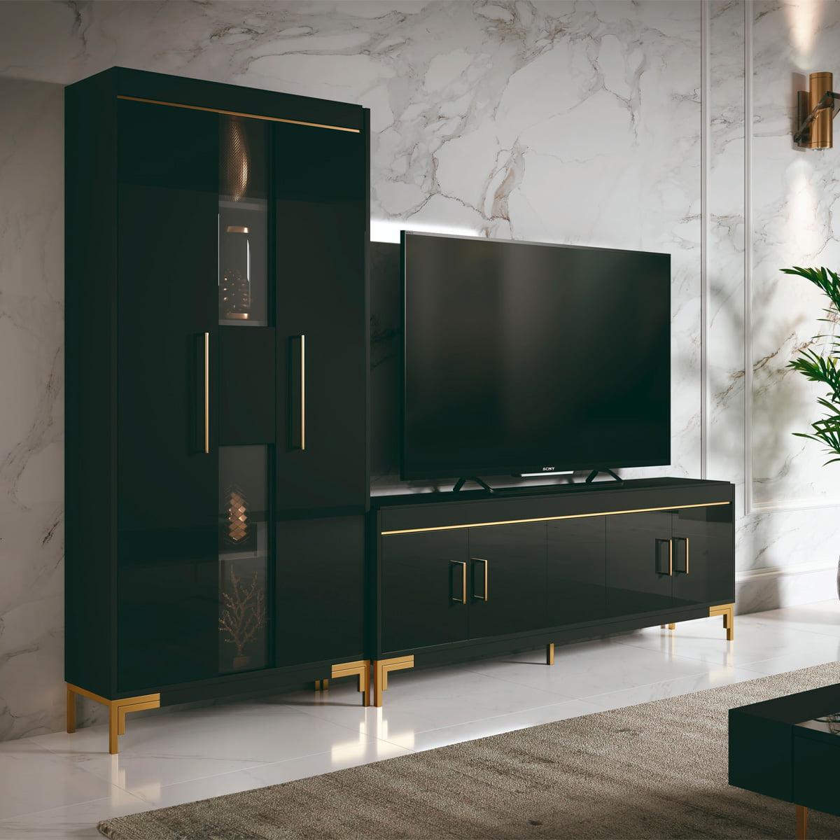 Esta vitrina moderna de diseño elegante destaca por su estructura en negro mate con detalles en oro brillante, ideal para exponer vajilla, libros o decoraciones en salones o comedores. Con dos puertas de cristal ahumado central que permiten vislumbrar el interior sin revelar completamente, ofrece un toque sofisticado y funcional. Sus patas elevadas y tiradores ergonómicos en oro aportan estabilidad y un aire lujoso, perfecta para hogares contemporáneos que buscan organización con estilo.