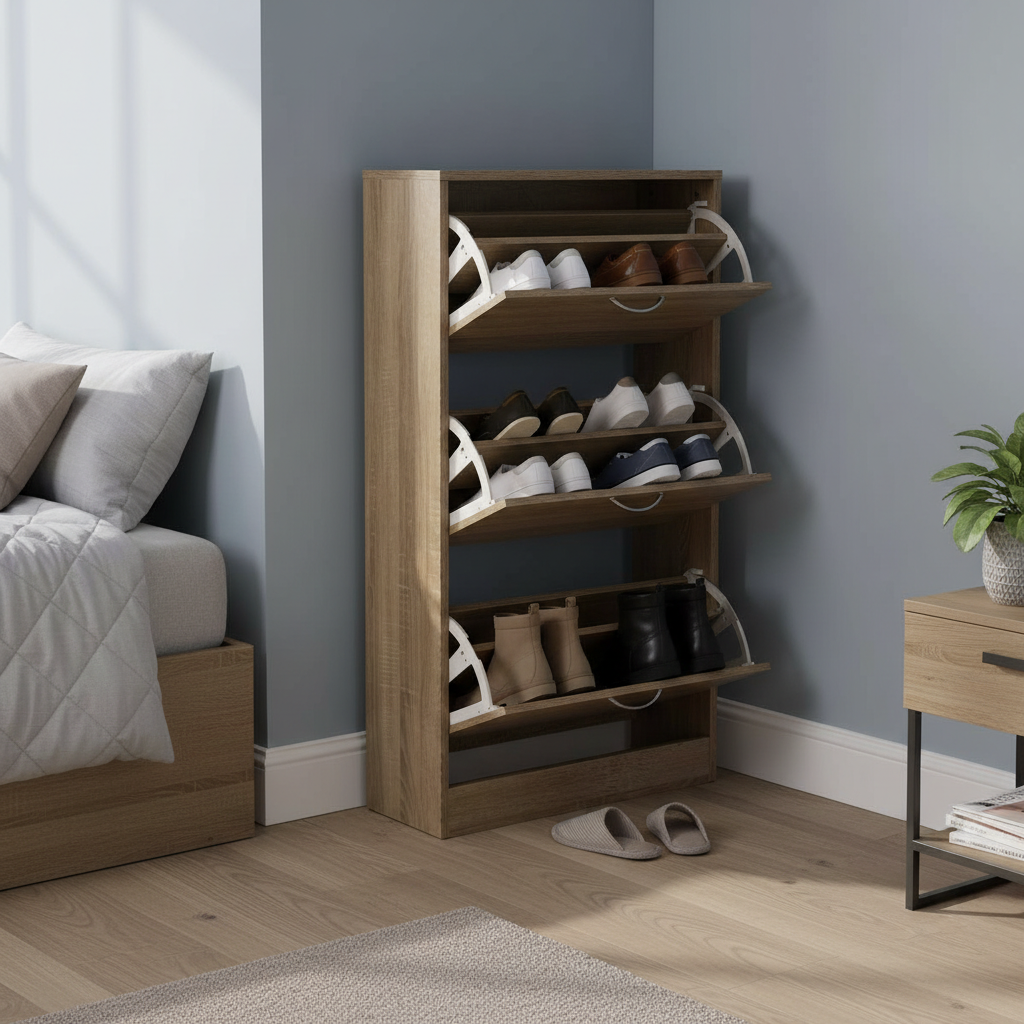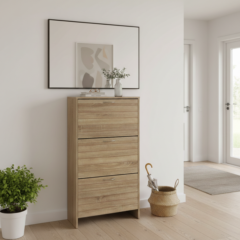 Este zapatero elegante y funcional está diseñado para organizar zapatos en el hogar. Fabricado en madera con acabado natural que imita vetas de madera clara, presenta tres estantes amplios con puertas abatibles equipadas con tiradores metálicos delgados y modernos. Su estructura estrecha y alta lo hace ideal para espacios reducidos como recibidores o pasillos, ofreciendo capacidad para múltiples pares de calzado de forma ordenada y estética. Destaca por su diseño minimalista y contemporáneo, con líneas limpias que se integran en cualquier decoración. Proporciona practicidad diaria al mantener los zapatos protegidos del polvo y accesibles con facilidad, elevando la organización del hogar con un toque natural y sofisticado.