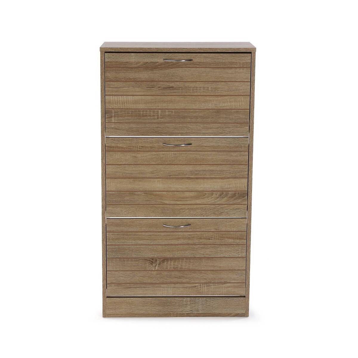 Zapatero de madera con tres estantes y puertas abatibles, diseño estrecho y moderno para organizar zapatos en recibidores. Acabado natural elegante y funcional.