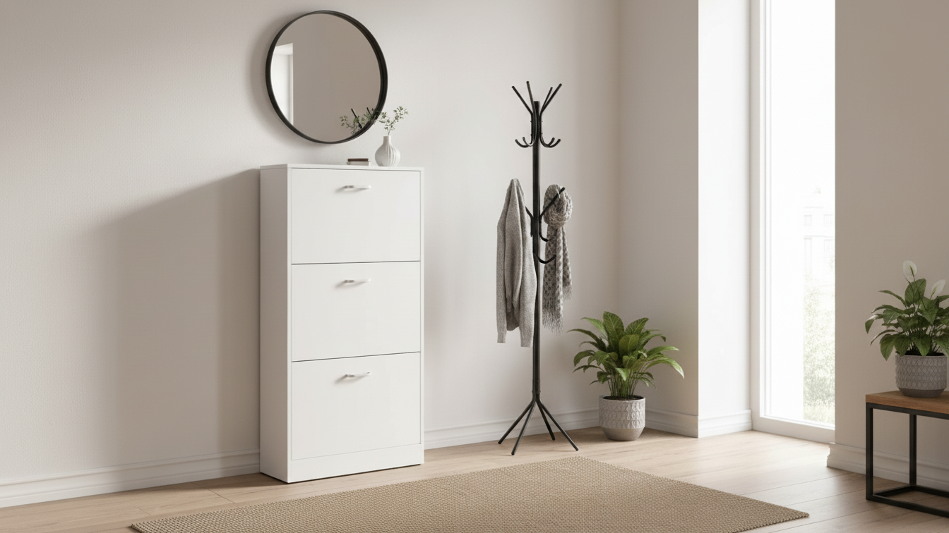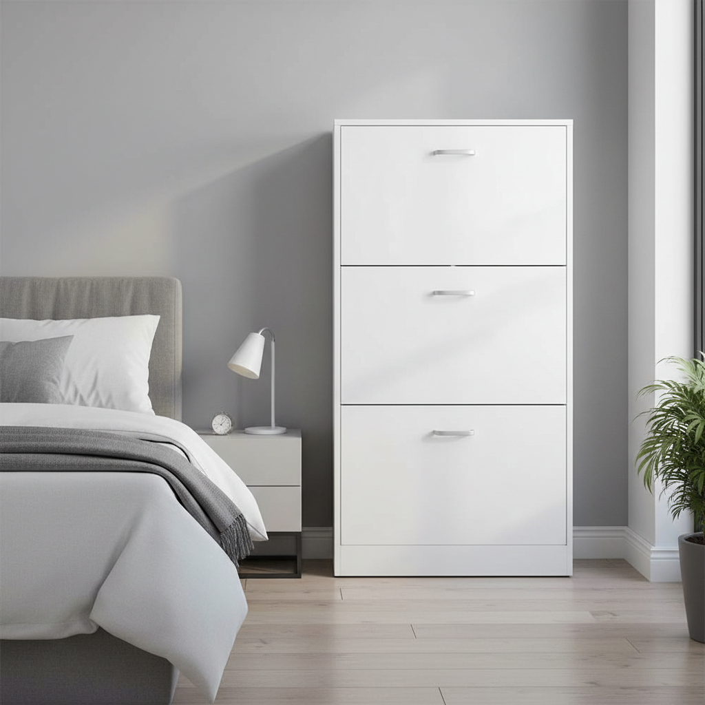 Zapatero alto y estrecho de tres puertas abatibles, pensado para pasillos y recibidores pequeños. Su estructura resistente de melamina ofrece gran capacidad para varios pares de calzado ocupando muy poco fondo.