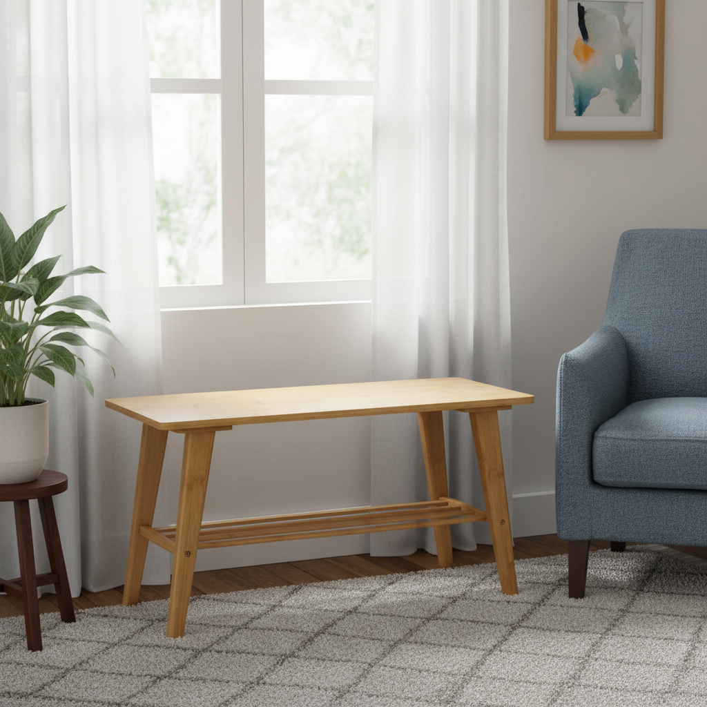 Zapatero escandinavo de madera natural con patas estilizadas y balda inferior para mayor capacidad. Diseño minimalista y funcional para entradas, aporta orden y calidez nórdica.