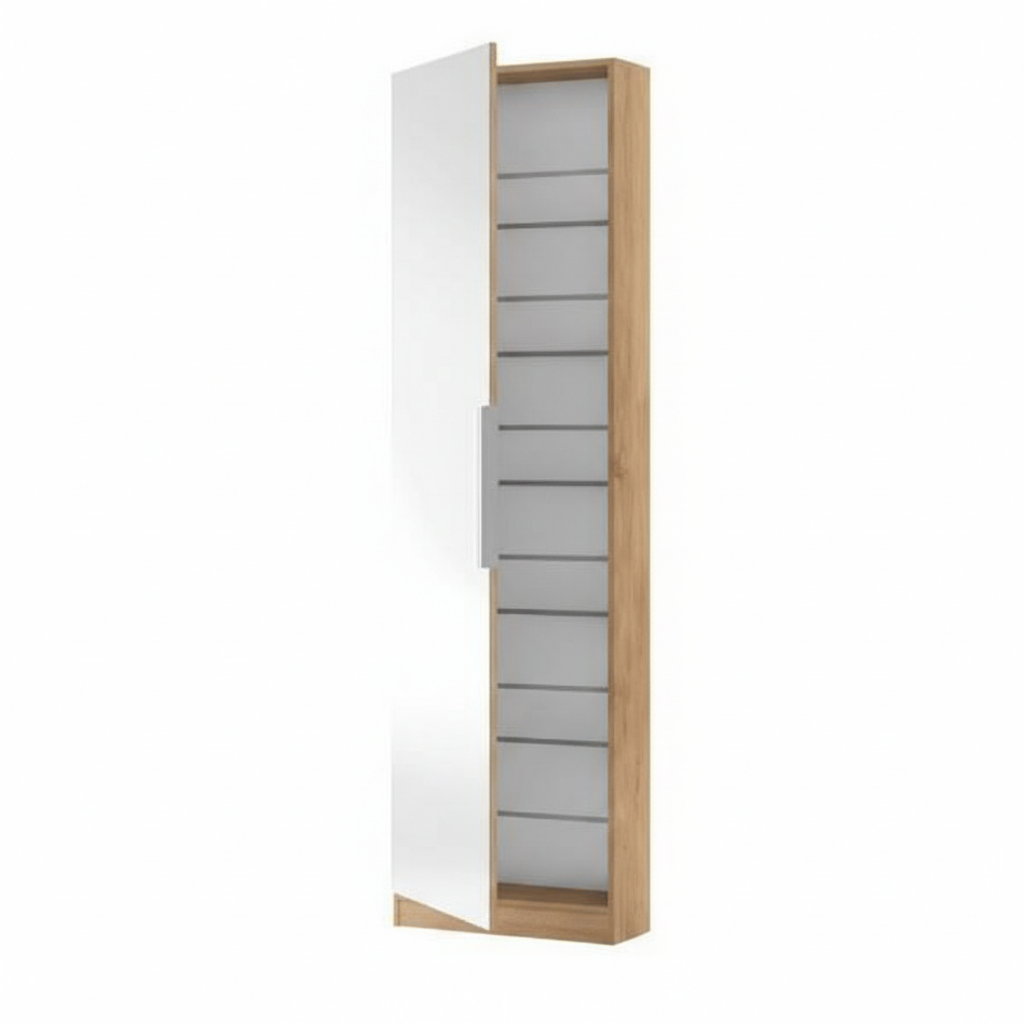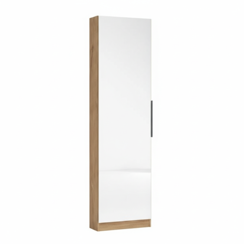 Zapatero alto de melamina blanco brillante y roble con puerta-espejo y estantes regulables. Diseño compacto, estable y elegante para cualquier rincón del hogar.