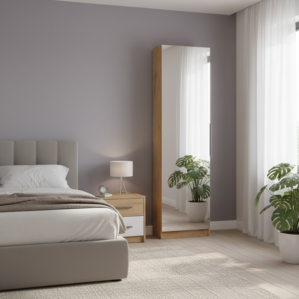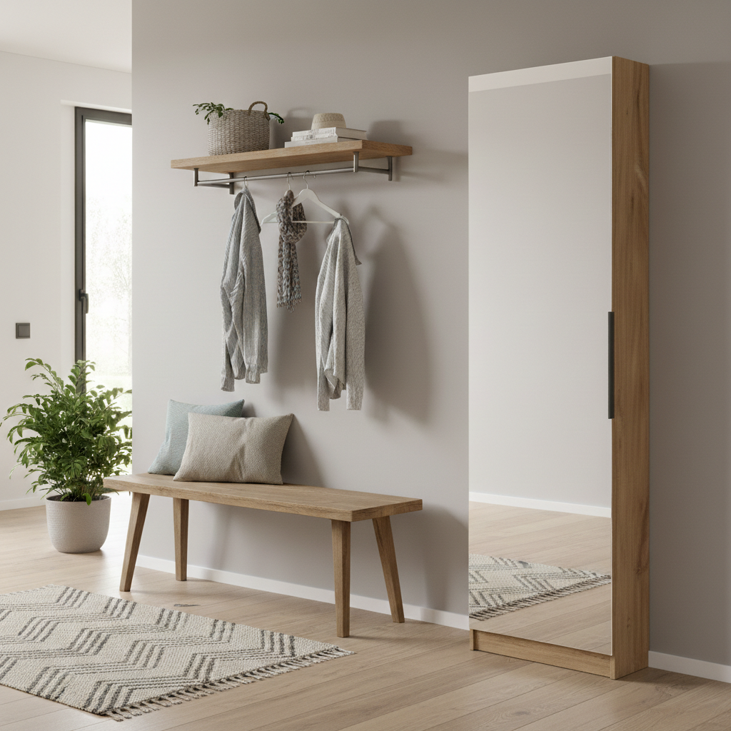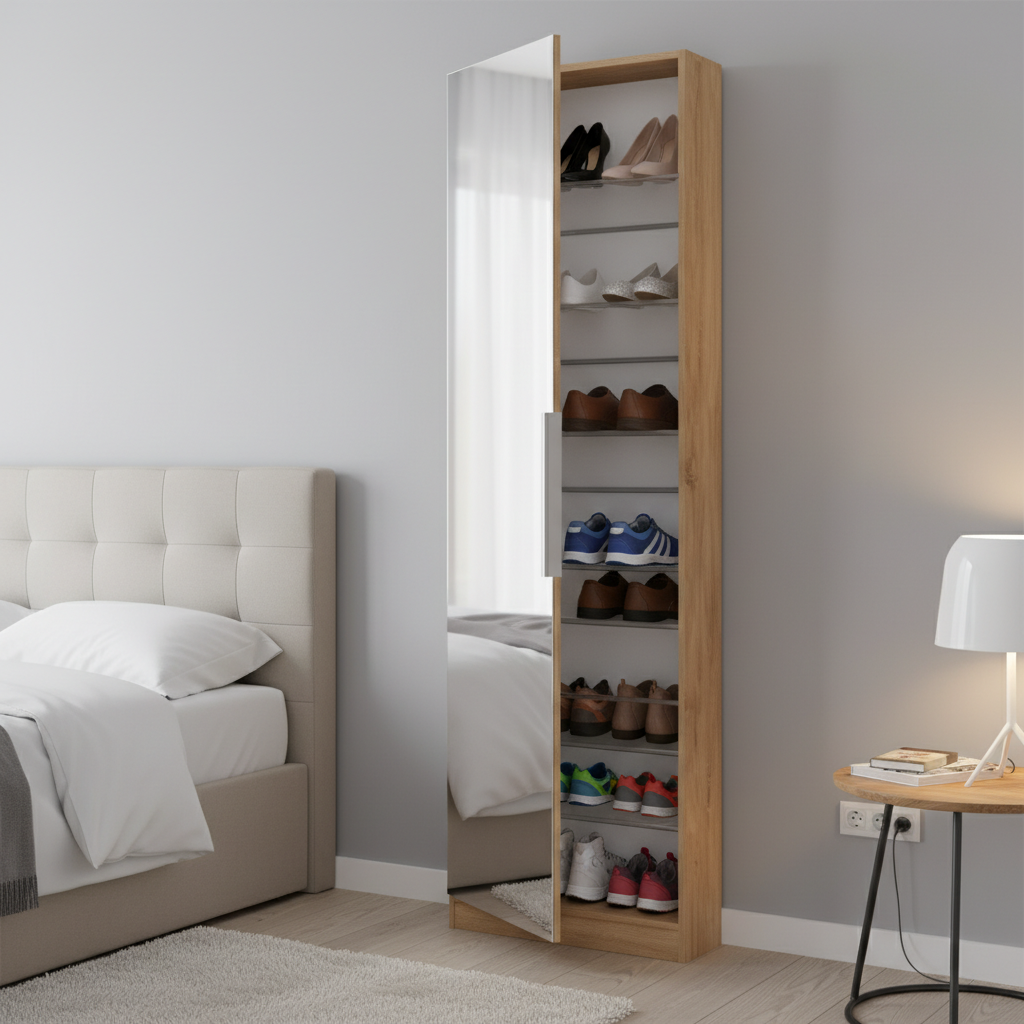 El zapatero “Trend” es un mueble estrecho y alto de melamina en acabado blanco brillante con estructura en roble, ideal para organizar zapatos en espacios reducidos. Cuenta con una puerta abatible con espejo completo que amplía visualmente el entorno y facilita vestirse. Dispone de múltiples estantes ajustables con varillas extraíbles de aluminio para soportar hasta 16 pares de zapatos de forma ordenada. Su diseño moderno incluye tirador ergonómico, bisagras metálicas resistentes, imán de cierre seguro y tacos antideslizantes en la base para mayor estabilidad. Perfecto para recibidores, dormitorios o pasillos, combina funcionalidad con estética minimalista, optimizando el almacenamiento sin ocupar mucho espacio.