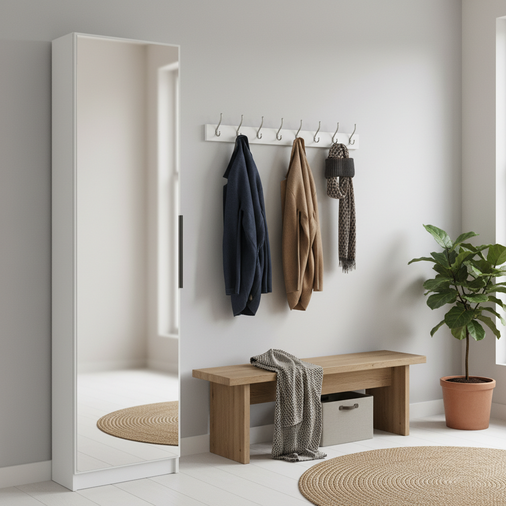Zapatero estrecho con puerta espejada, ideal para organizar zapatos en espacios reducidos. Diseño moderno, funcional y discreto para entradas.