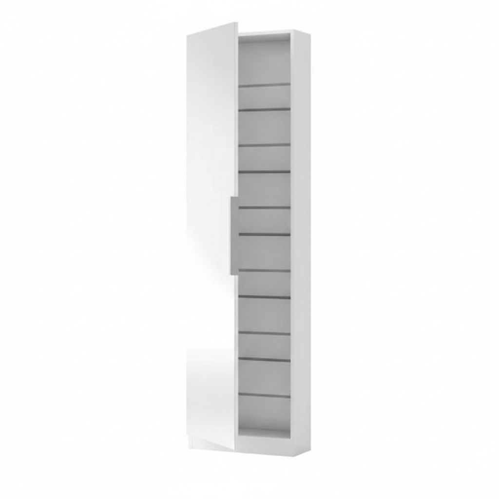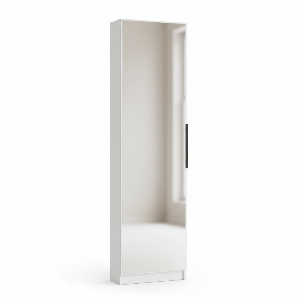 • Medidas: 50 cm de ancho, 180 cm de alto y 20 cm de fondo. • Material principal: melamina o tablero aglomerado con acabado blanco brillante o mate. • Capacidad: para 12-16 pares de zapatos según modelo. • Puerta: abatible con espejo integrado de grandes dimensiones. • Estructura interior: baldas o varillas ajustables de aluminio o metal. • Sistema de apertura: herrajes metálicos resistentes.