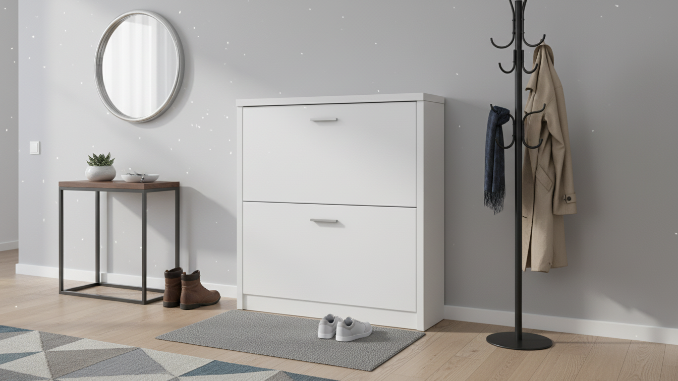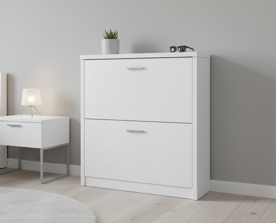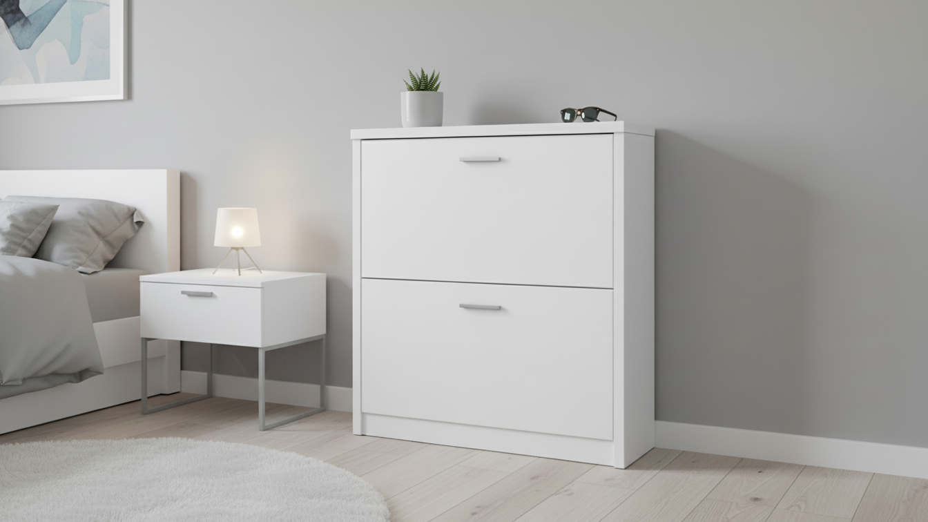 Zapatero auxiliar de diseño moderno y líneas rectas, ideal para recibidores y pasillos estrechos. Ofrece espacio para varios pares de zapatos en un mueble compacto, ayudando a mantener la entrada ordenada y despejada.