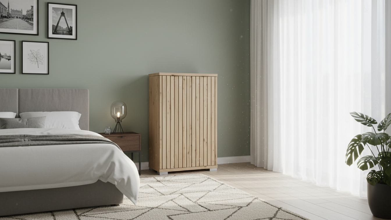 Este zapatero vertical de líneas rectas ofrece una solución práctica y elegante para mantener el calzado ordenado en espacios reducidos. Su diseño tipo armario con puertas cerradas protege los zapatos del polvo y ayuda a mantener el recibidor o dormitorio despejado. La estructura compacta permite colocar el mueble junto a la entrada, en un pasillo estrecho o dentro de un vestidor sin ocupar demasiado espacio. La distribución interior está pensada para almacenar varios pares de zapatos de uso diario y de temporada, facilitando el acceso y la organización según necesidades familiares. Es una pieza funcional que combina estética moderna y gran capacidad.