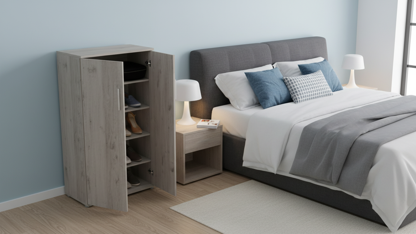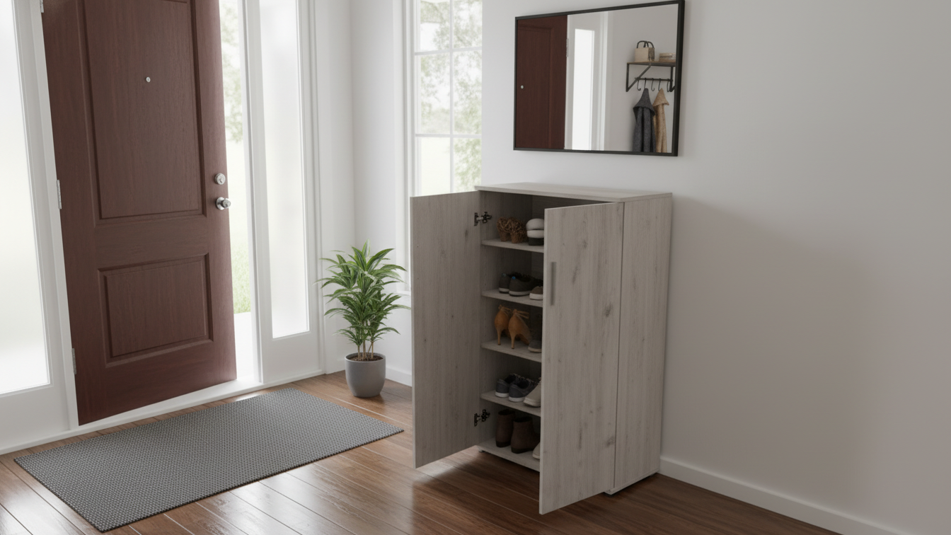 Zapatero funcional y compacto en formato armario, con dos puertas y estantes interiores regulables, perfecto para optimizar espacios estrechos y mantener el calzado ordenado y protegido en el día a día.