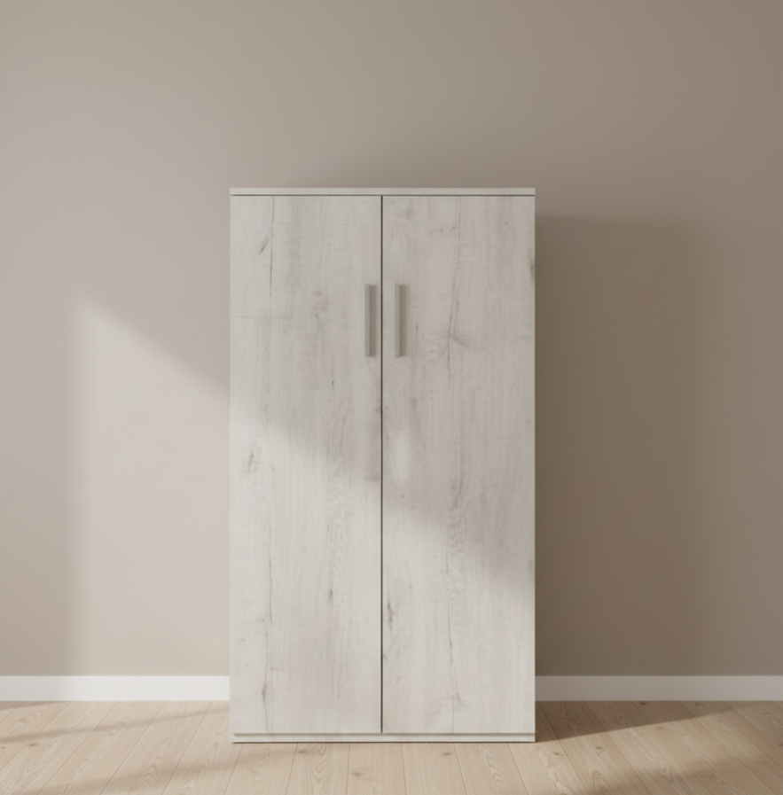 Zapatero tipo armario de diseño moderno y líneas rectas, ideal para organizar el calzado en recibidores o dormitorios. Con estructura alta y estrecha, aprovecha muy bien el espacio vertical y encaja en huecos reducidos. Sus dos puertas frontales ocultan estantes regulables, permitiendo adaptar el interior a distintos tipos de zapatos y mantener la estancia siempre ordenada. Fabricado en tablero de partículas con recubrimiento melamínico, ofrece una superficie resistente al uso diario y de fácil limpieza. Los tiradores rectos aportan un toque actual y facilitan una apertura cómoda, convirtiendo este zapatero en una solución práctica y discreta para el hogar.