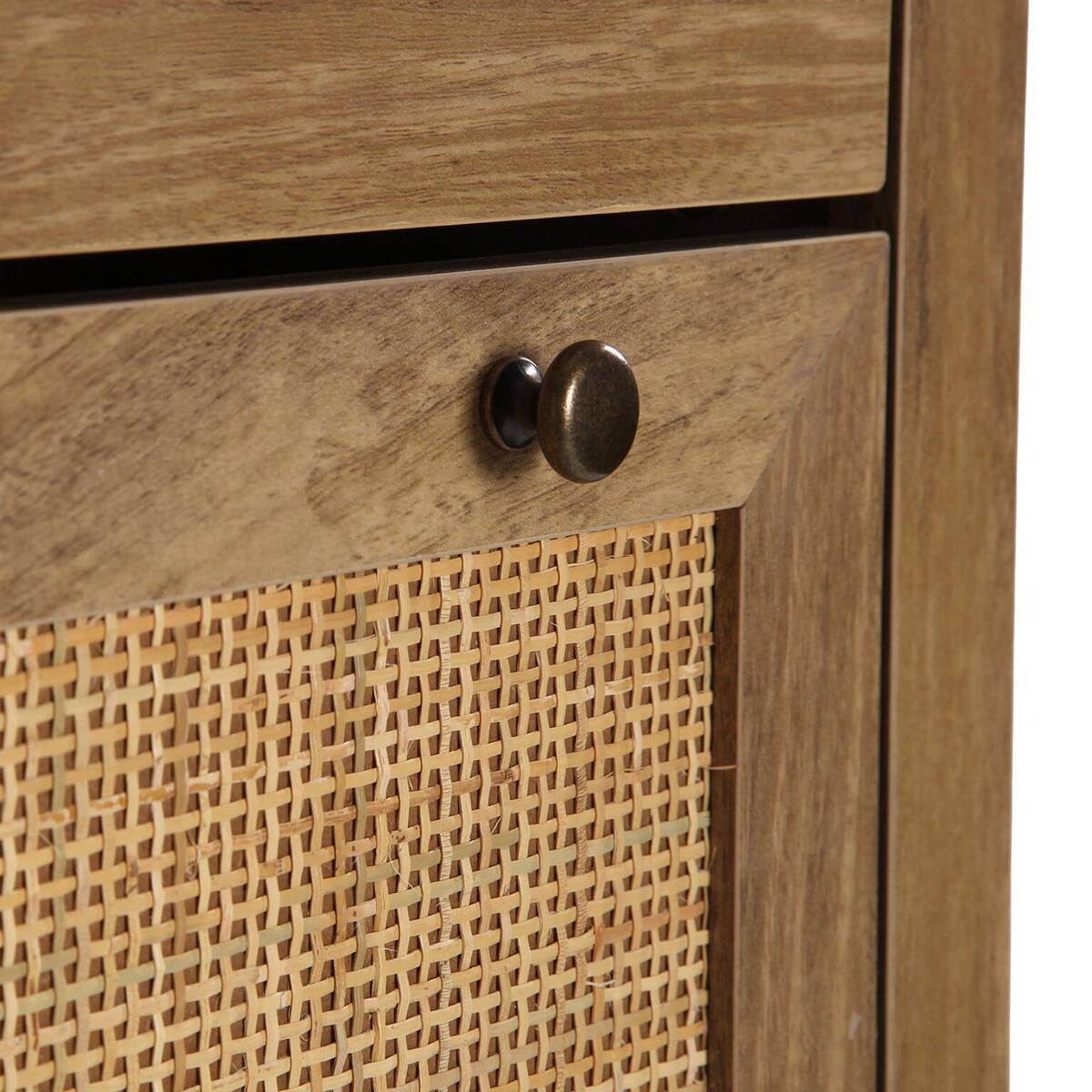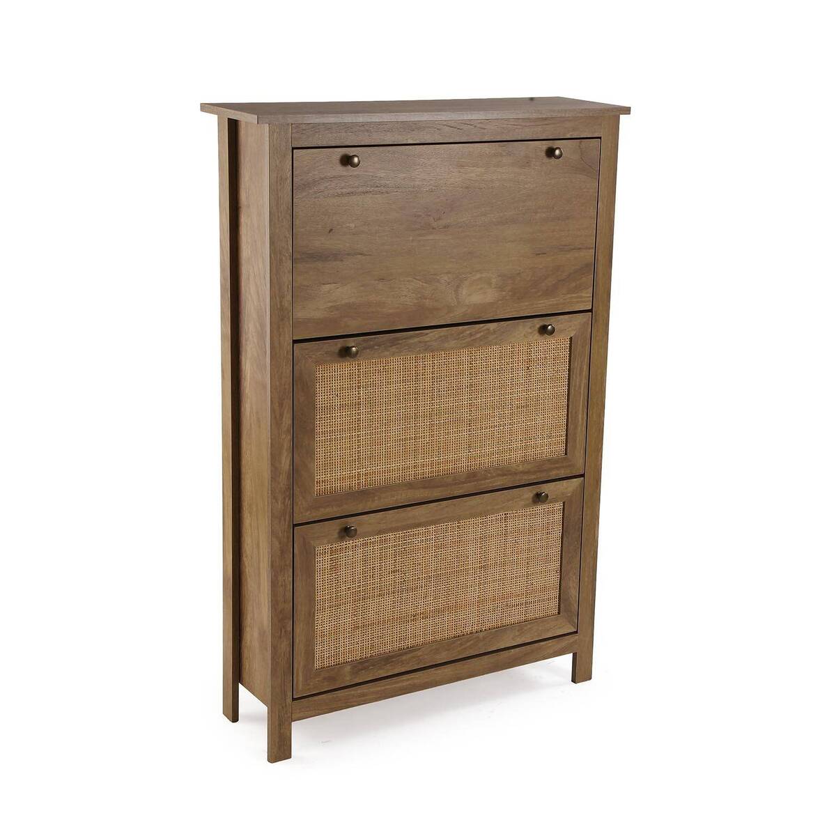 Zapatero bohemio de madera con armario superior abatible y dos puertas inferiores de mimbre, perfecto para organizar zapatos con ventilación natural y estilo natural.