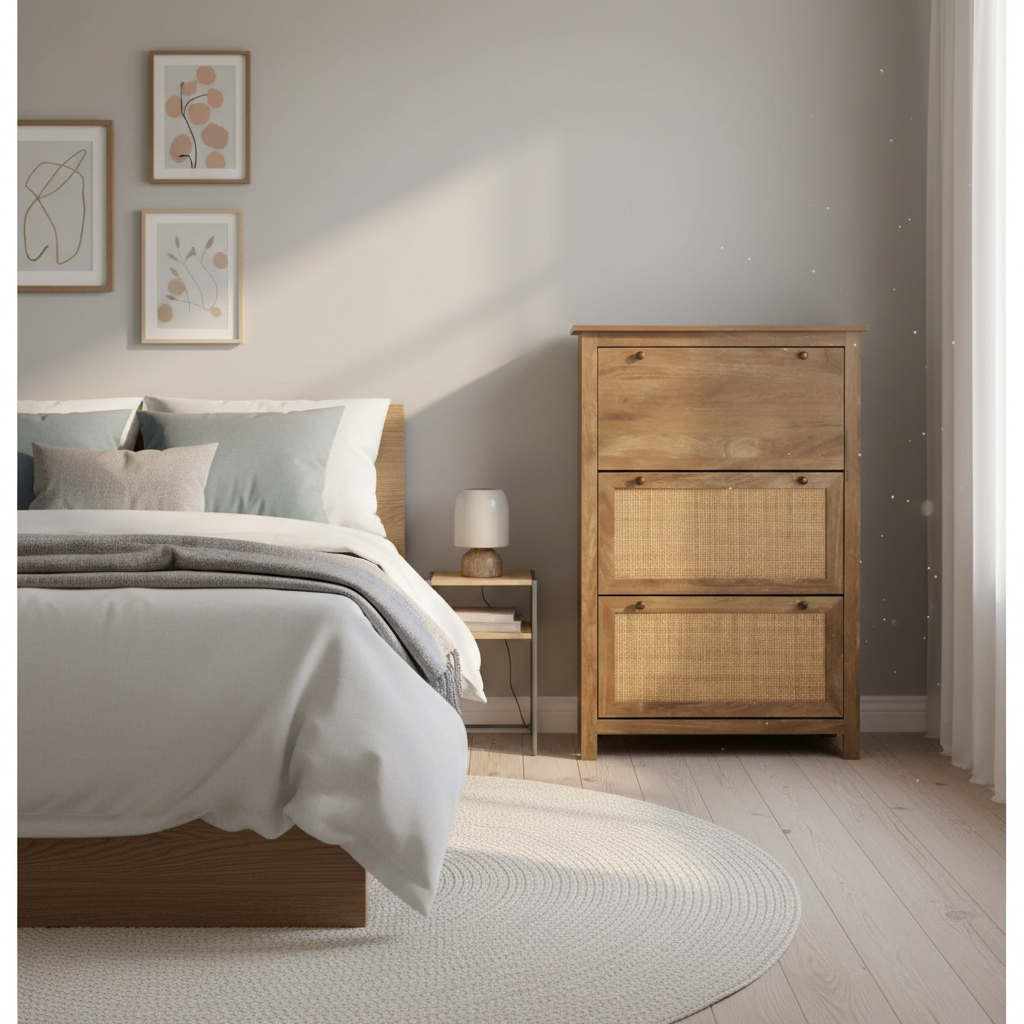 Ofrece ventilación natural gracias al mimbre, evitando olores, y un diseño versátil que organiza zapatos y accesorios en espacios reducidos.