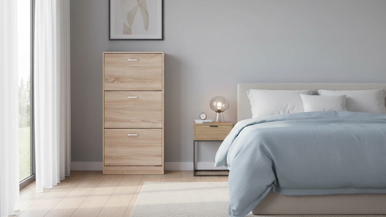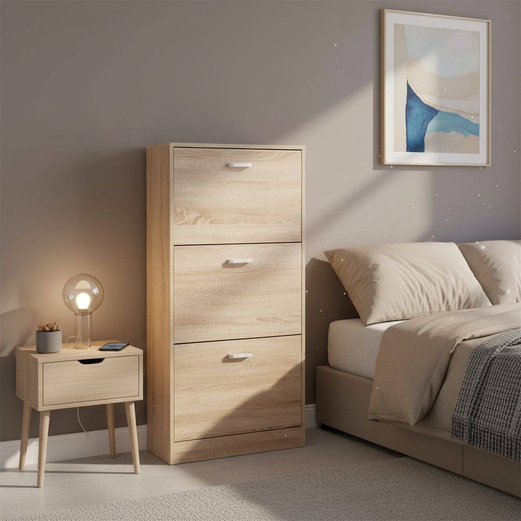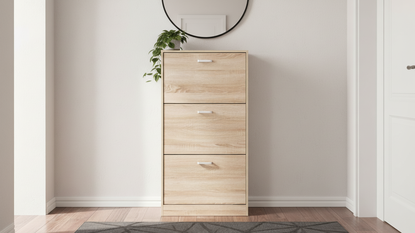Zapatero compacto de tres puertas abatibles, perfecto para espacios reducidos y para mantener el calzado ordenado y oculto en la entrada o el dormitorio.