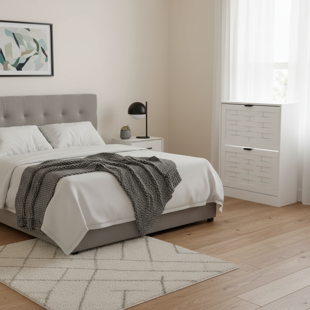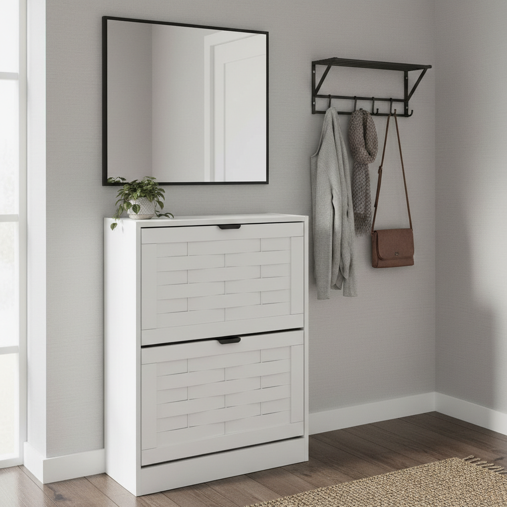 Este zapatero destaca por su diseño contemporáneo en blanco con puertas de entramado que aportan un toque sofisticado y aireado. Dispone de dos cajones profundos con tiradores ergonómicos, perfectos para almacenar zapatos de uso diario o botas. Fabricado con materiales resistentes como tableros de MDF, ofrece durabilidad y facilidad de montaje. Su estructura estable se adapta a entradas estrechas, manteniendo el calzado ordenado y protegido del polvo. Ideal para hogares con espacio limitado, combina funcionalidad con estética minimalista, elevando la organización del hogar de forma práctica y atractiva.