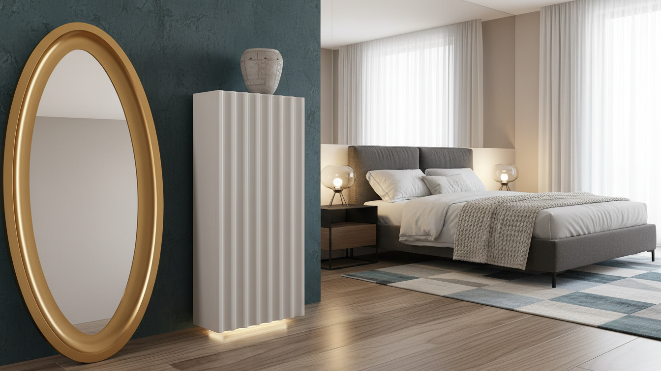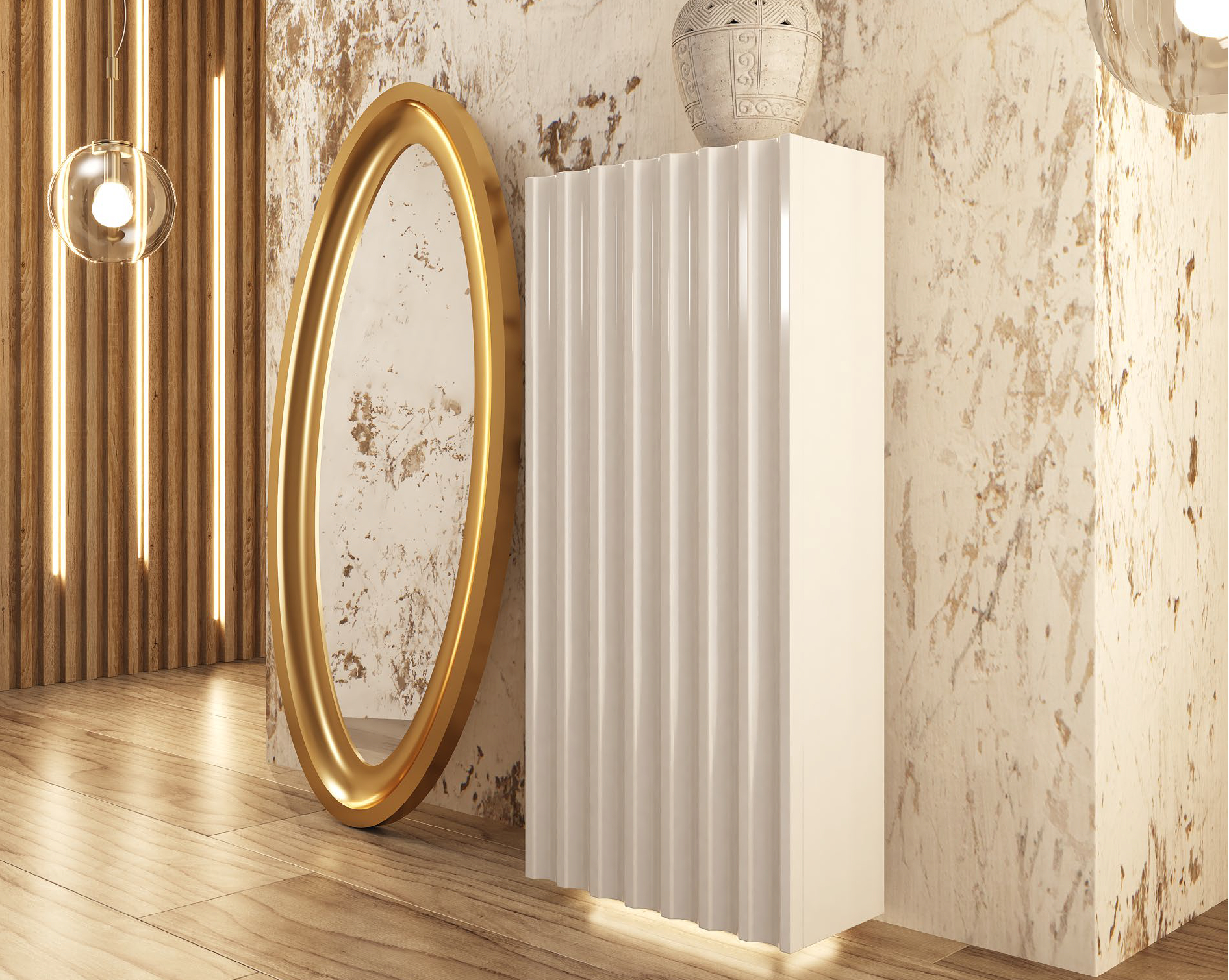 El zapatero Z23 es un mueble vertical y estrecho con diseño moderno de líneas onduladas, ideal para organizar hasta 15 pares de zapatos en espacios reducidos como recibidores o dormitorios. Su estructura elegante y minimalista, con paneles lisos y base estable, ofrece un almacenamiento práctico y discreto que se integra en cualquier decoración contemporánea.