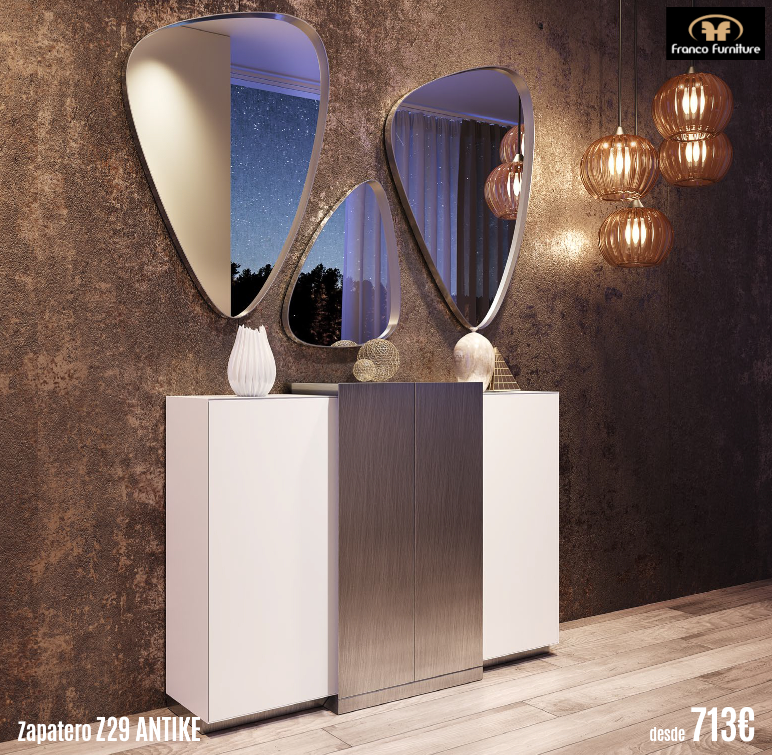 Zapatero moderno con laterales blancos lacados y panel central metálico brushed. Diseño minimalista de tres secciones para organizar zapatos en recibidores. Estructura estable, fácil de limpiar y duradera para uso diario.