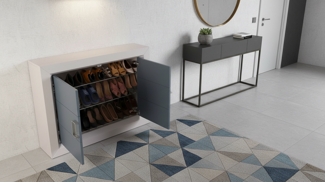 Mueble zapatero moderno con marco prominente y puerta de paneles abatibles. Diseño elegante que oculta y organiza zapatos, perfecto para entradas. Estructura estable con asas ergonómicas.