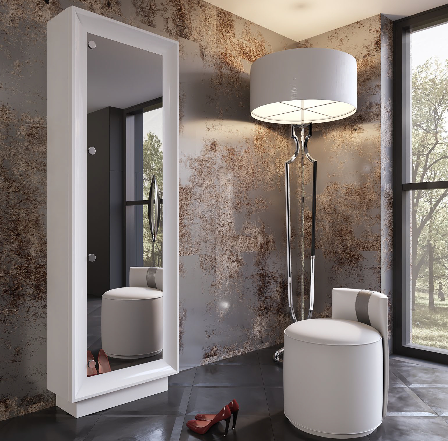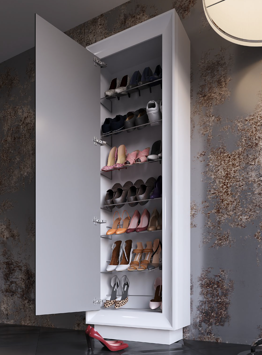 El zapatero Z49 Antike es un mueble vertical elegante y funcional, ideal para organizar hasta 21 pares de zapatos en recibidores o dormitorios. Su diseño lacado en acabado brillante ofrece un aspecto moderno y sofisticado, con una puerta principal que integra un amplio espejo de cuerpo entero para revisar el atuendo completo. Cuenta con múltiples estantes interiores ajustables que facilitan el acceso y mantienen el calzado protegido del polvo y la humedad, maximizando el espacio vertical en hogares contemporáneos. Este zapatero combina practicidad con estética, aportando luminosidad y amplitud visual al entorno gracias al reflejo del espejo.