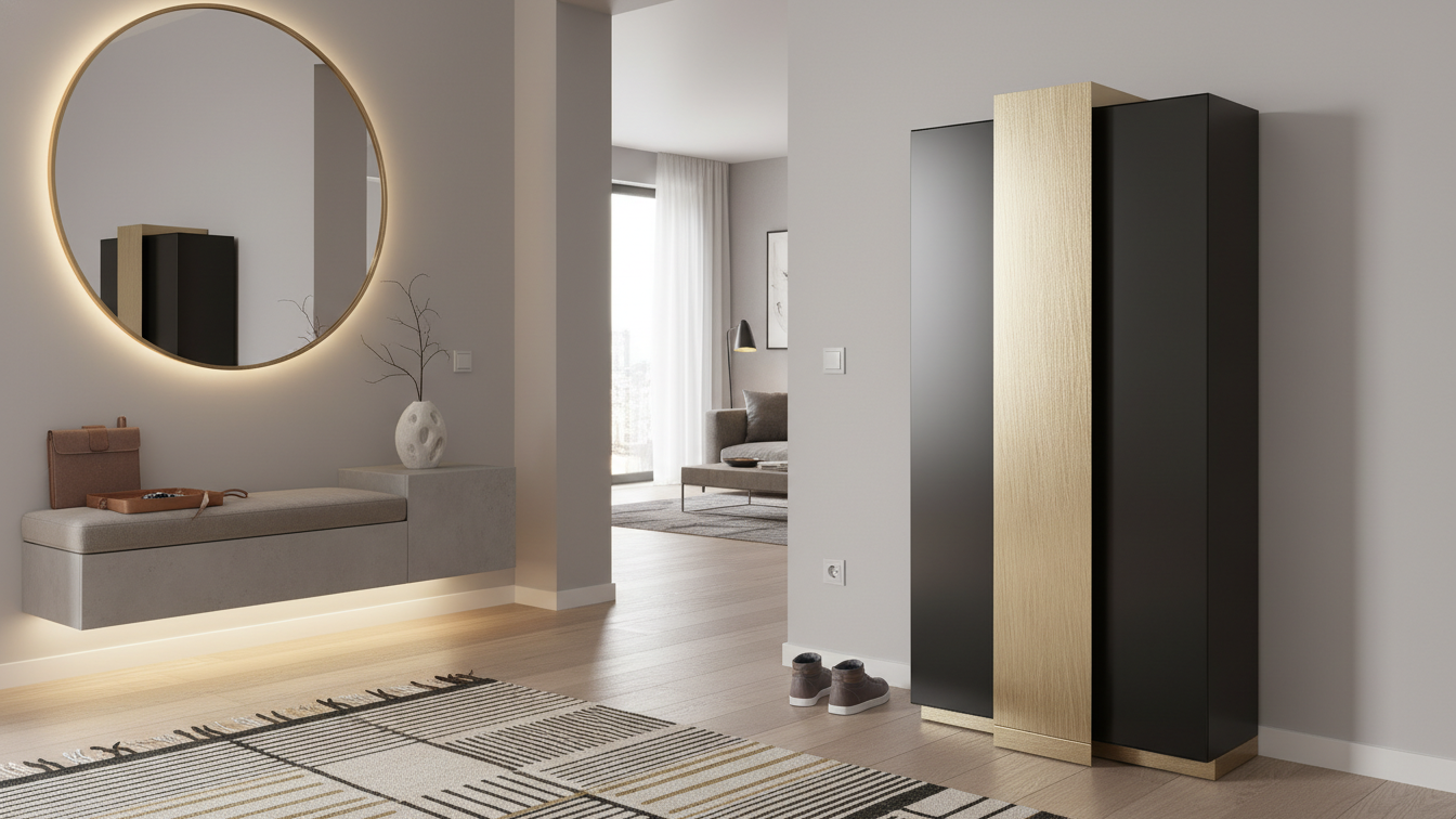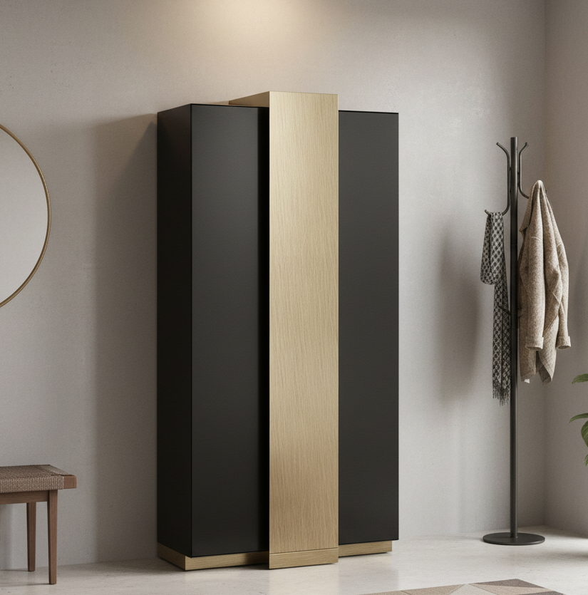 El zapatero Z53 Antike es un mueble elegante y moderno con estructura alta y estilizada, destacando por su combinación de acabados en negro mate y detalles en oro brillante que aportan un toque de lujo y sofisticación. Su diseño minimalista presenta una puerta principal con apertura lateral, posiblemente corredera, flanqueada por paneles verticales que realzan su silueta esbelta y armónica. Ideal para recibidores o dormitorios, ofrece múltiples estantes interiores inclinados para organizar zapatos de forma ordenada y accesible, maximizando el espacio sin sacrificar estética. La base elevada con patas estilizadas eleva su presencia visual, integrándose perfectamente en ambientes contemporáneos o industriales. Su construcción robusta asegura estabilidad, mientras que las líneas limpias y el contraste cromático lo convierten en una pieza decorativa funcional que eleva cualquier estancia.
